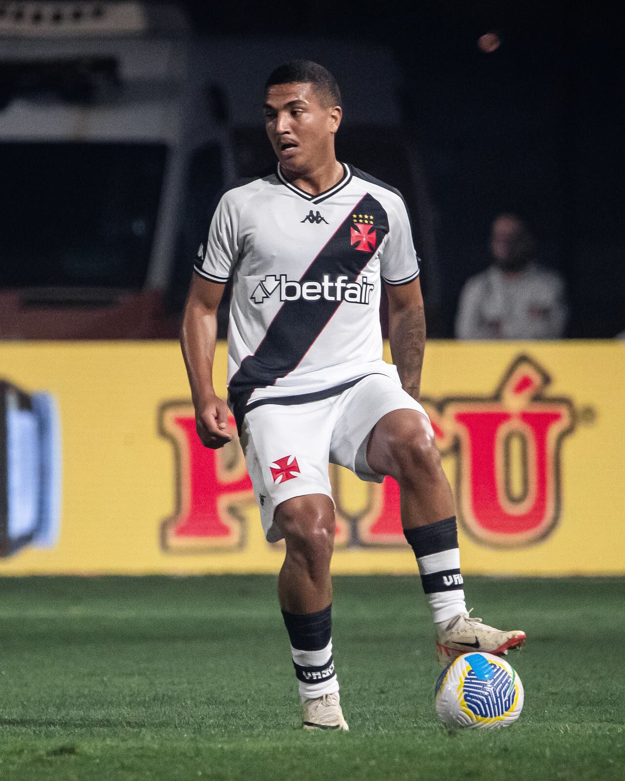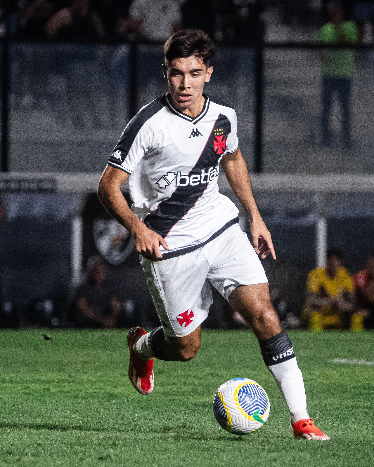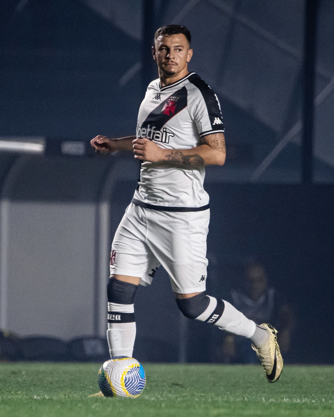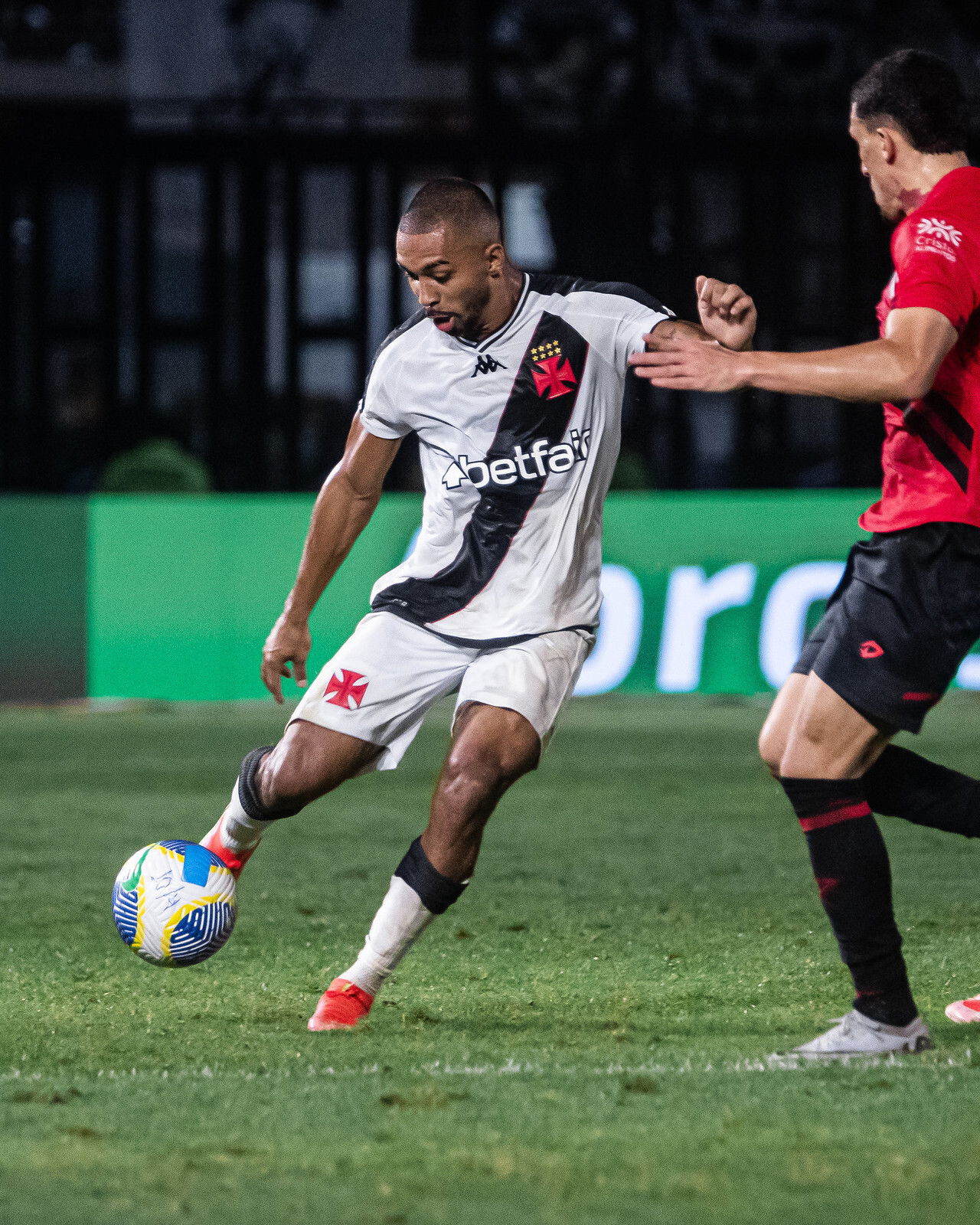 Vasco jogando com uniforme preto e branco, jogador em ação com a bola.