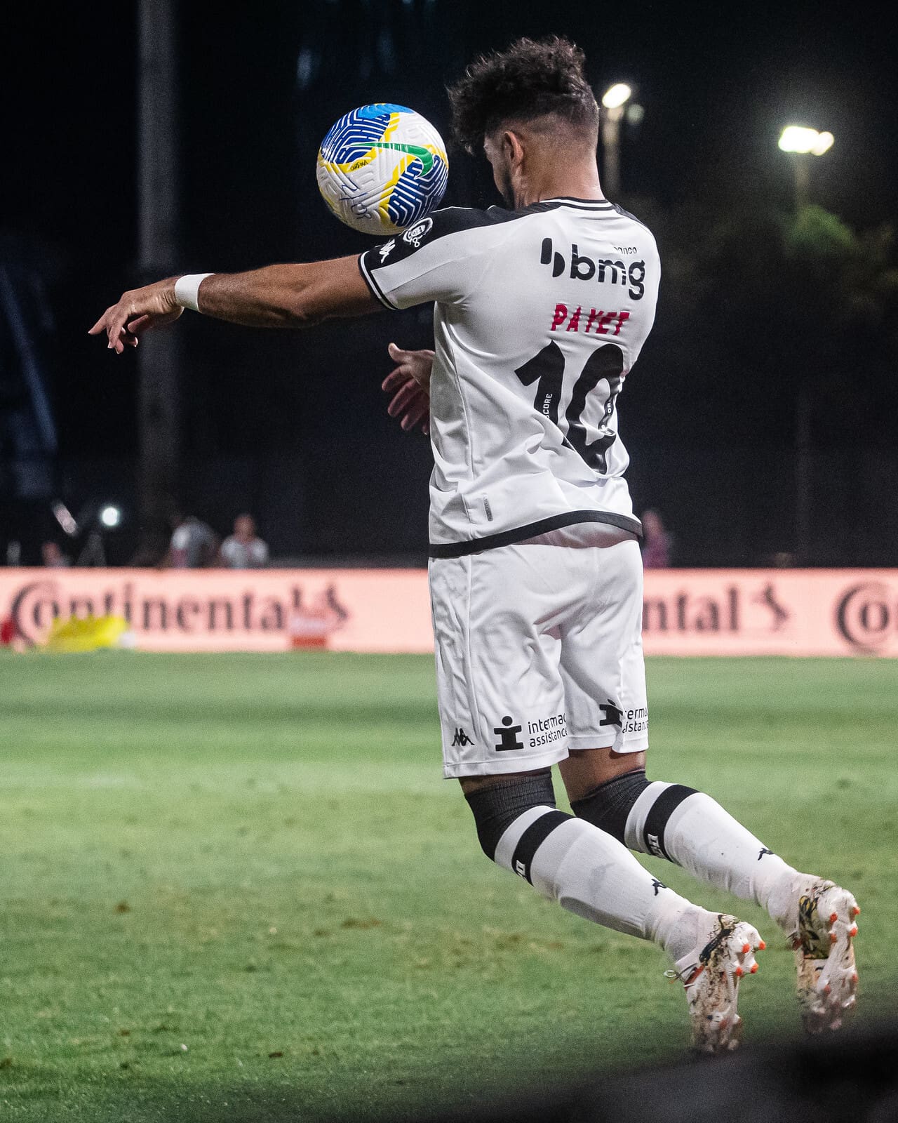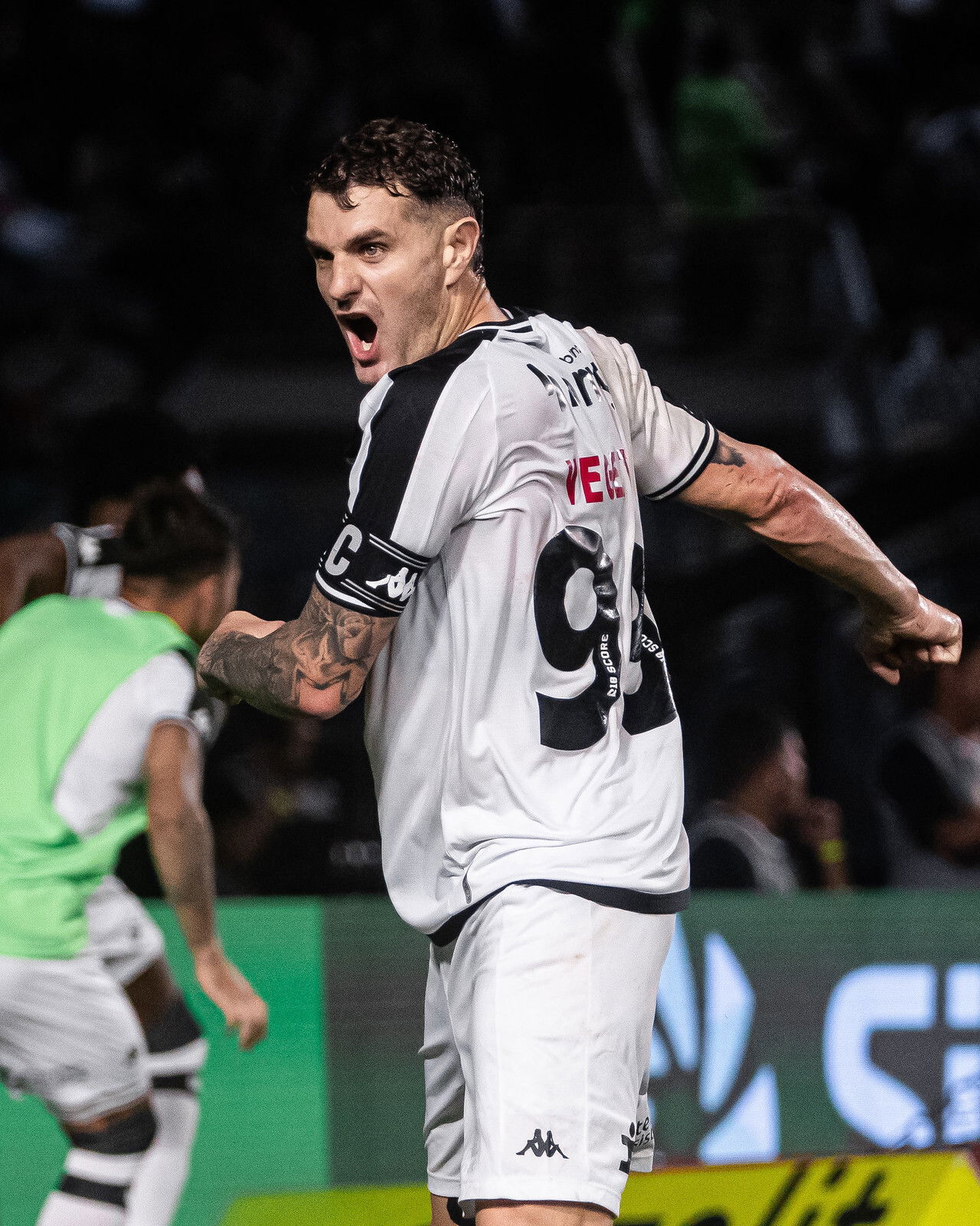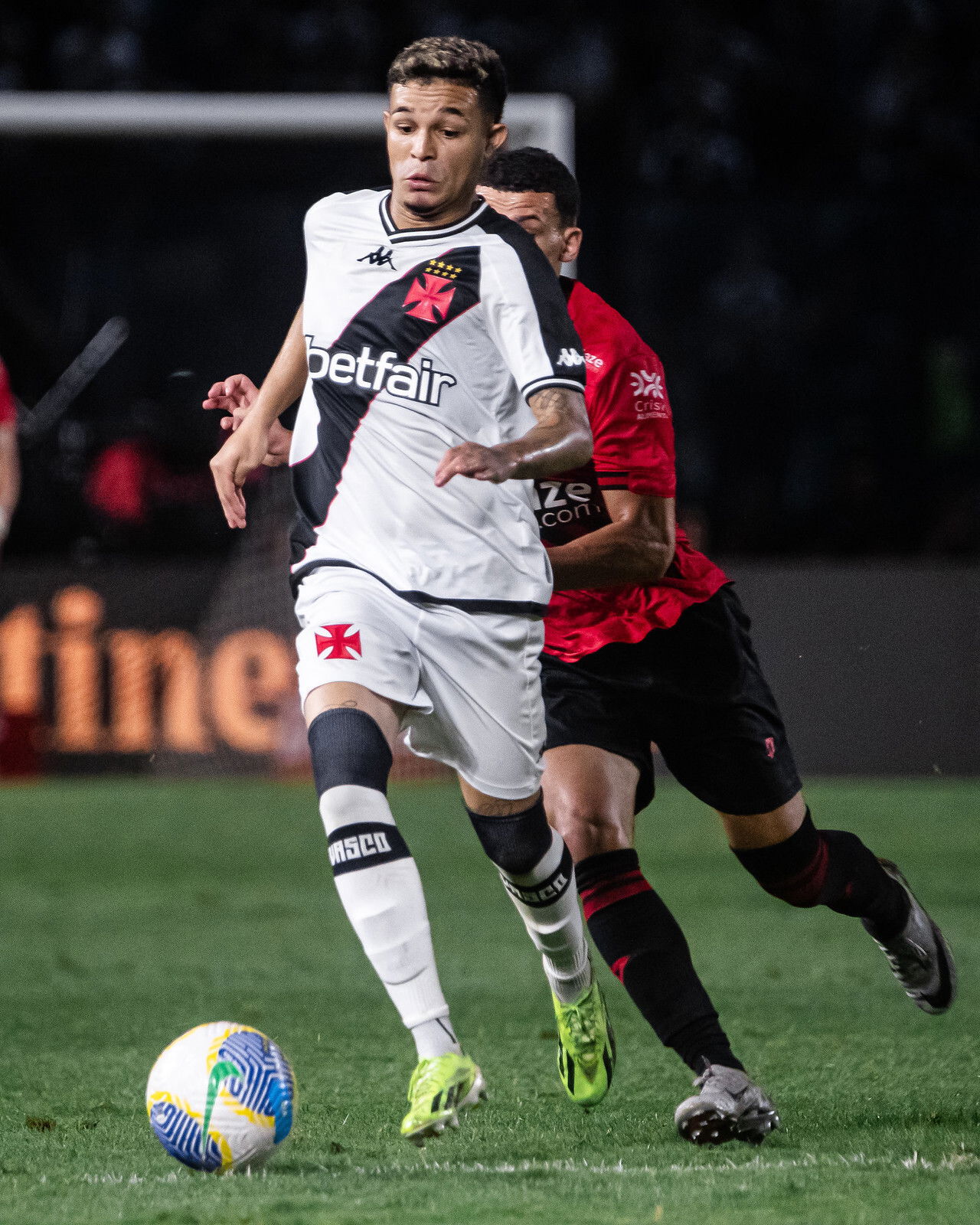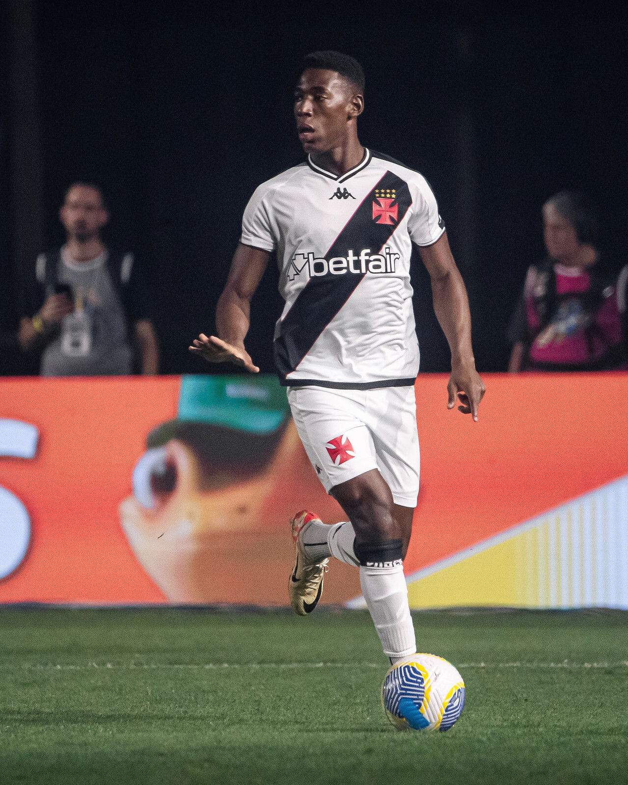 Vasco jogando com uniforme preto e branco, jogador em ação com a bola.
