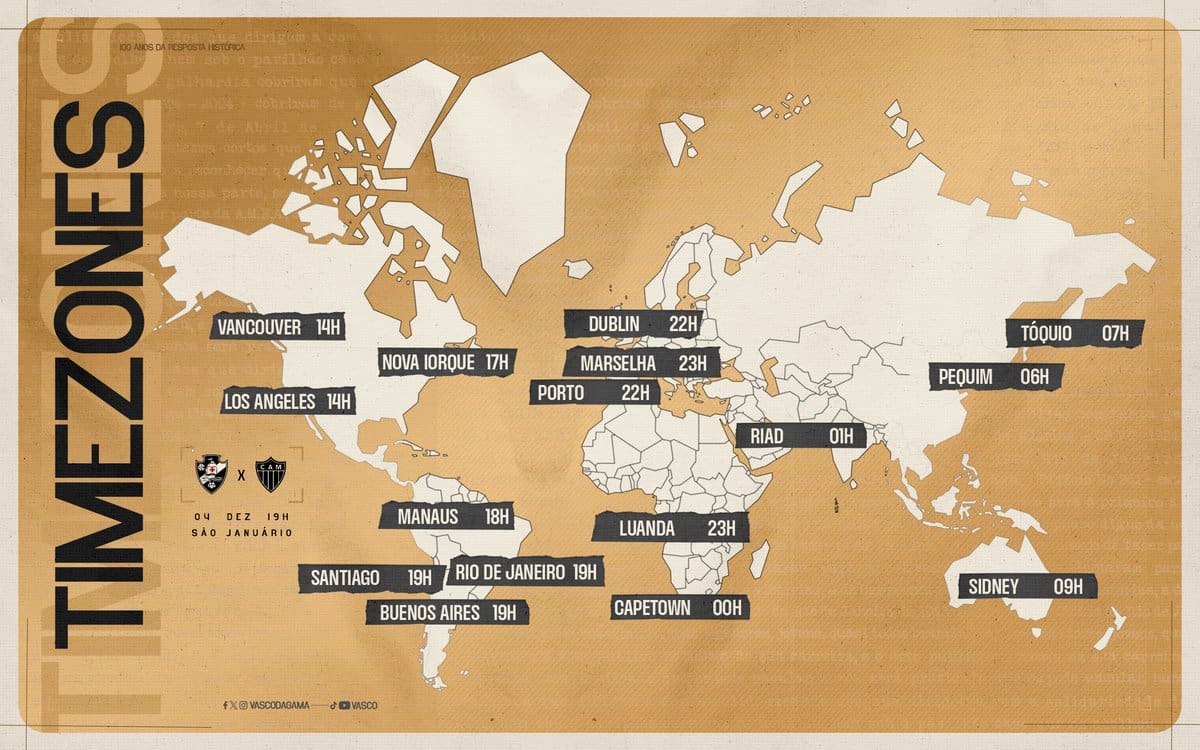 Vasco divulga o horário da partida contra o Atlético-MG em diferentes regiões do mundo.