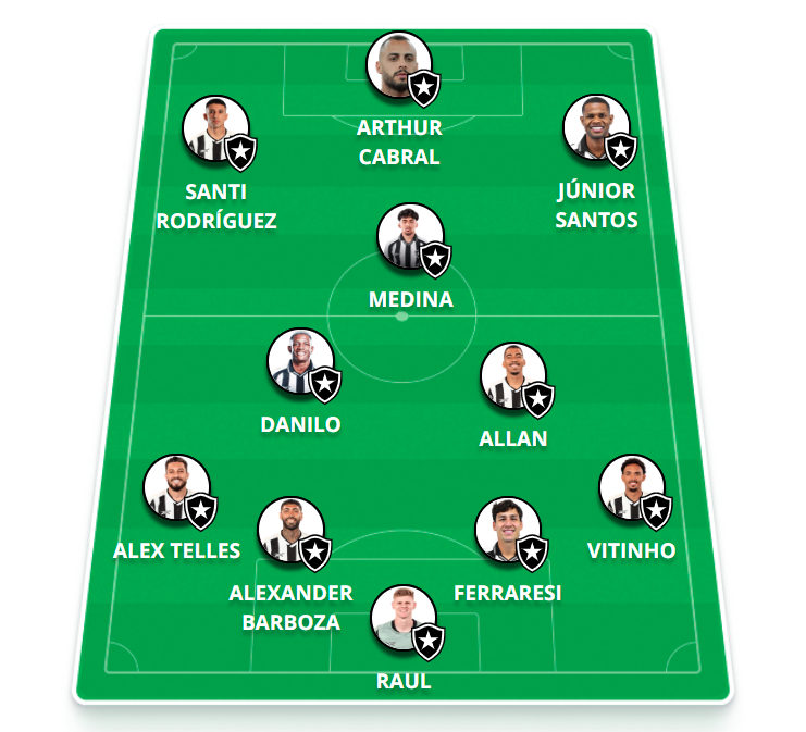 Provável escalação: Raul; Vitinho, Ferraresi, Barboza, Alex Telles; Allan, Danilo, Medina; Santi Rodríguez (Edenilson), Júnior Santos, Arthur Cabral.