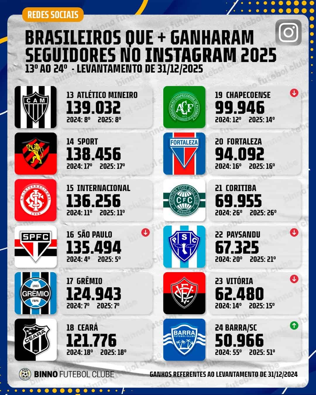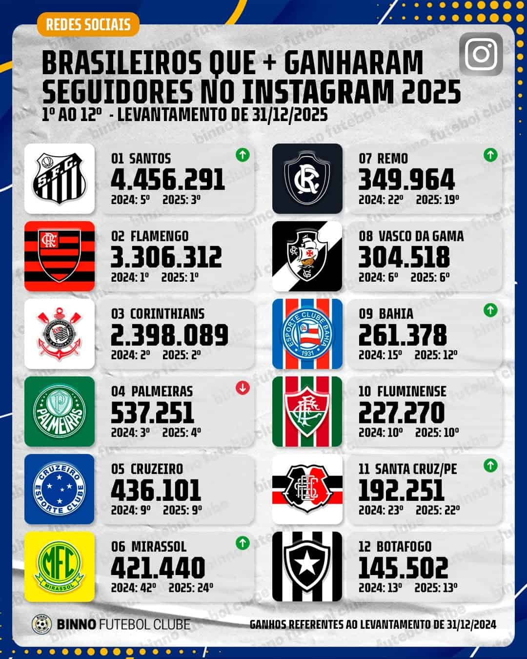 ❓ Quantos seguidores o seu clube ganhou no Instagram em 2025?