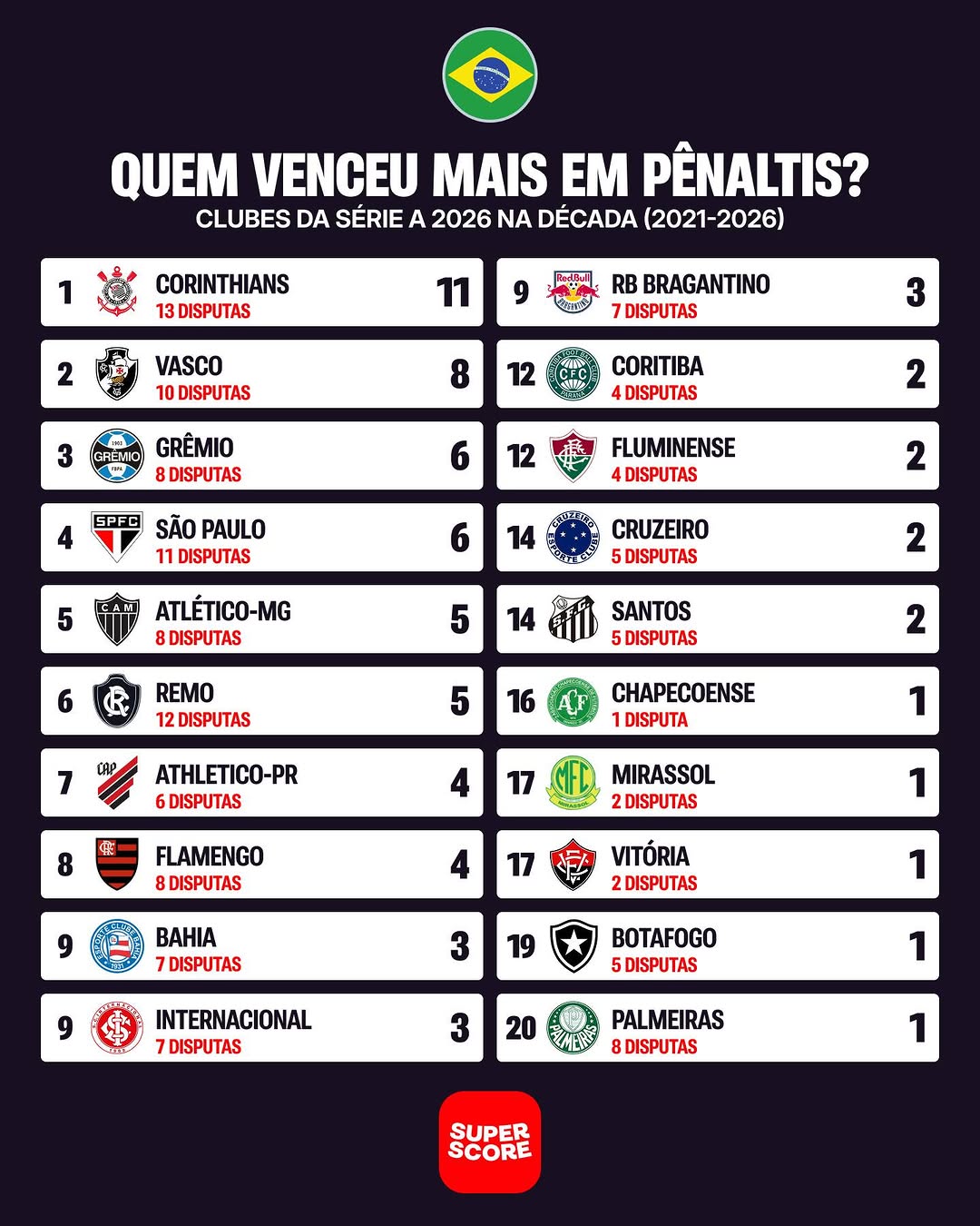 Quem mais venceu disputas por pênaltis entre os clubes do Brasileirão na década de 2020. Levantamos aqui o desempenho dos clubes nas decisões desde 2021. Veja a lista: