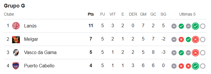 Após a conclusão da 5ª rodada da fase de grupos da Copa Sul-Americana, o Vasco, que perdeu para o Lanús por 1 a 0, caiu para a 3ª posição no Grupo G. Para garantir uma vaga nos playoffs contra um dos times eliminados da Libertadores, o Gigante da Colina precisa vencer o Melgar na última rodada, que ocorrerá em São Januário.