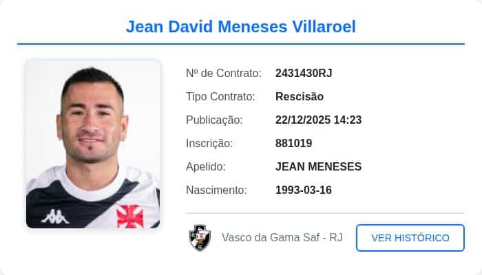 🚨 O Vasco da Gama acaba de oficializar a rescisão do contrato do atacante Jean David, uma decisão que impacta diretamente o elenco na sequência da temporada. A saída do jogador pode abrir espaço para novas contratações em busca de uma recuperação no desempenho da equipe.