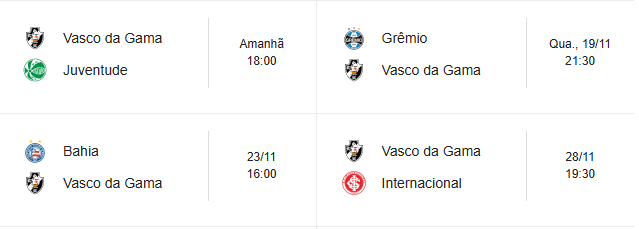 O Vasco se prepara para encerrar o mês de novembro enfrentando times do Rio Grande do Sul em três dos quatro jogos restantes.