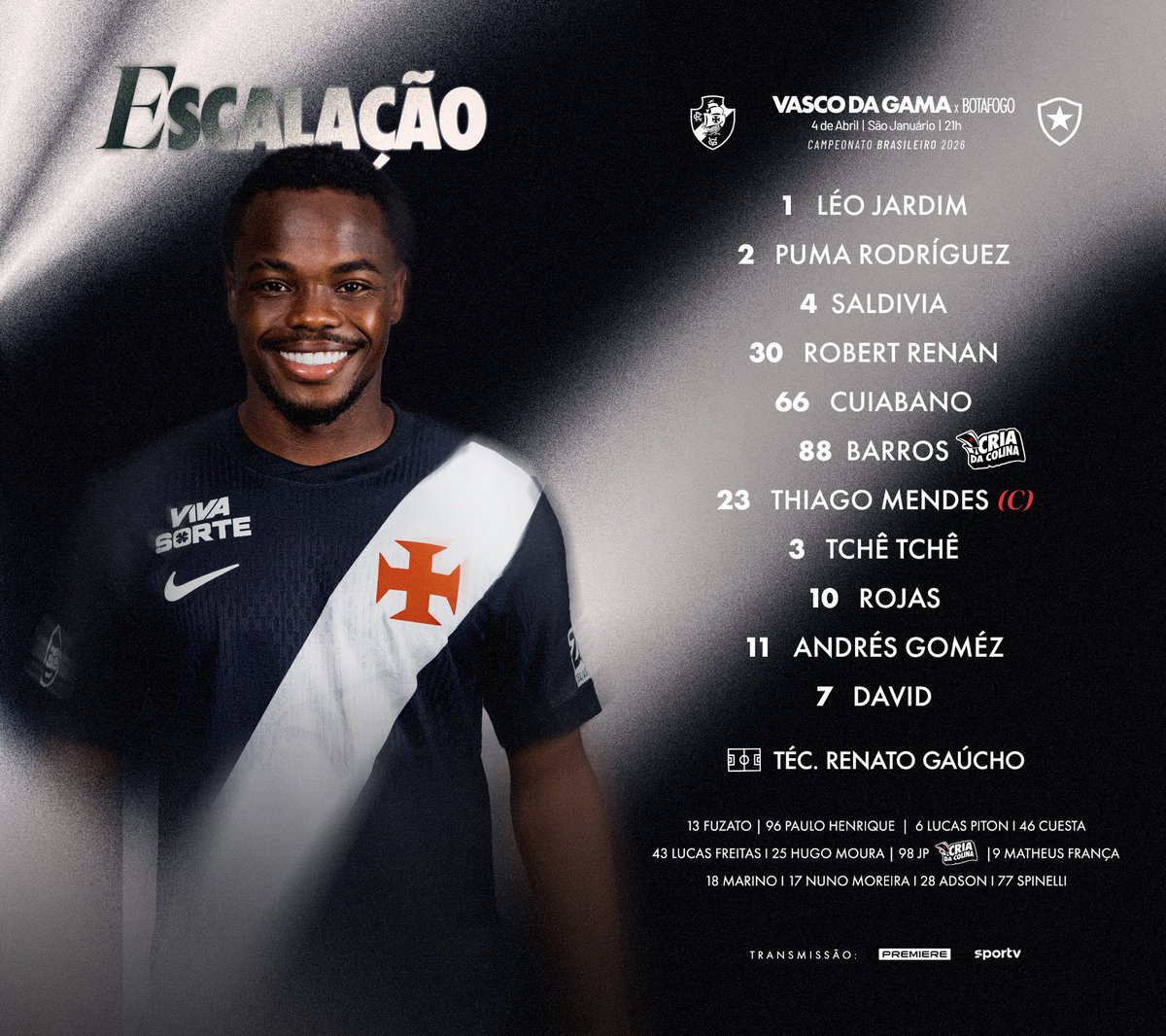 Puma Rodríguez, Cuiabano, Barros, Andrés Gómez e Rojas são as novidades na escalação do Vasco contra o Botafogo.
