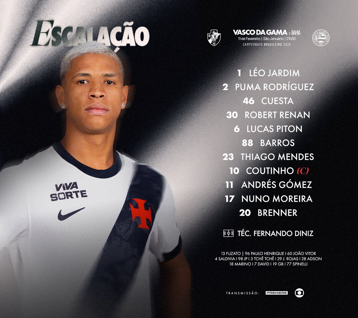 Vasco enfrenta o Bahia com Spinelli como novidade no banco de reservas