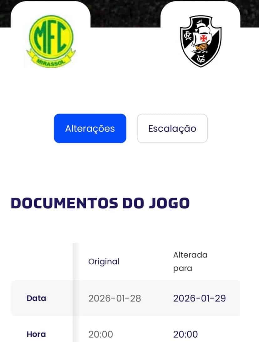 A CBF anunciou uma mudança na data de estreia do Vasco no Campeonato Brasileiro. A partida entre Mirassol e Vasco, que inicialmente estava agendada para o dia 28 de janeiro (quarta-feira), às 20h, foi remarcada para o dia 29 de janeiro (quinta-feira), também às 20h.