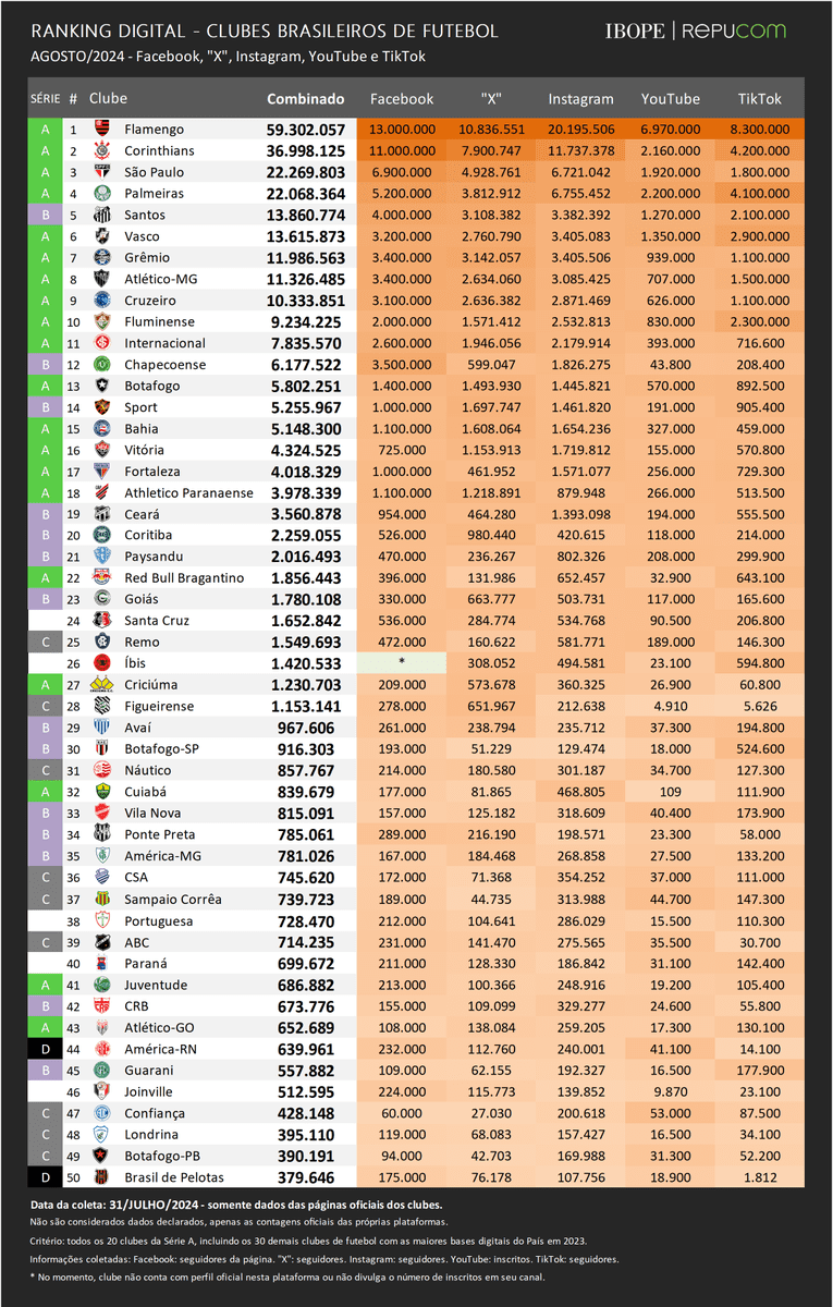 Times com mais seguidores nas mídias sociais em agosto de 2024 (milhões de usuários):