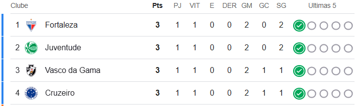 Após a conclusão da 1ª rodada do Campeonato Brasileiro, o Vasco, que venceu o Santos por 2 a 1, ocupa a 3ª posição, garantindo assim uma vaga na zona de classificação para a Libertadores.