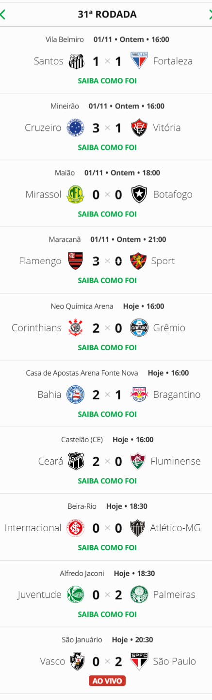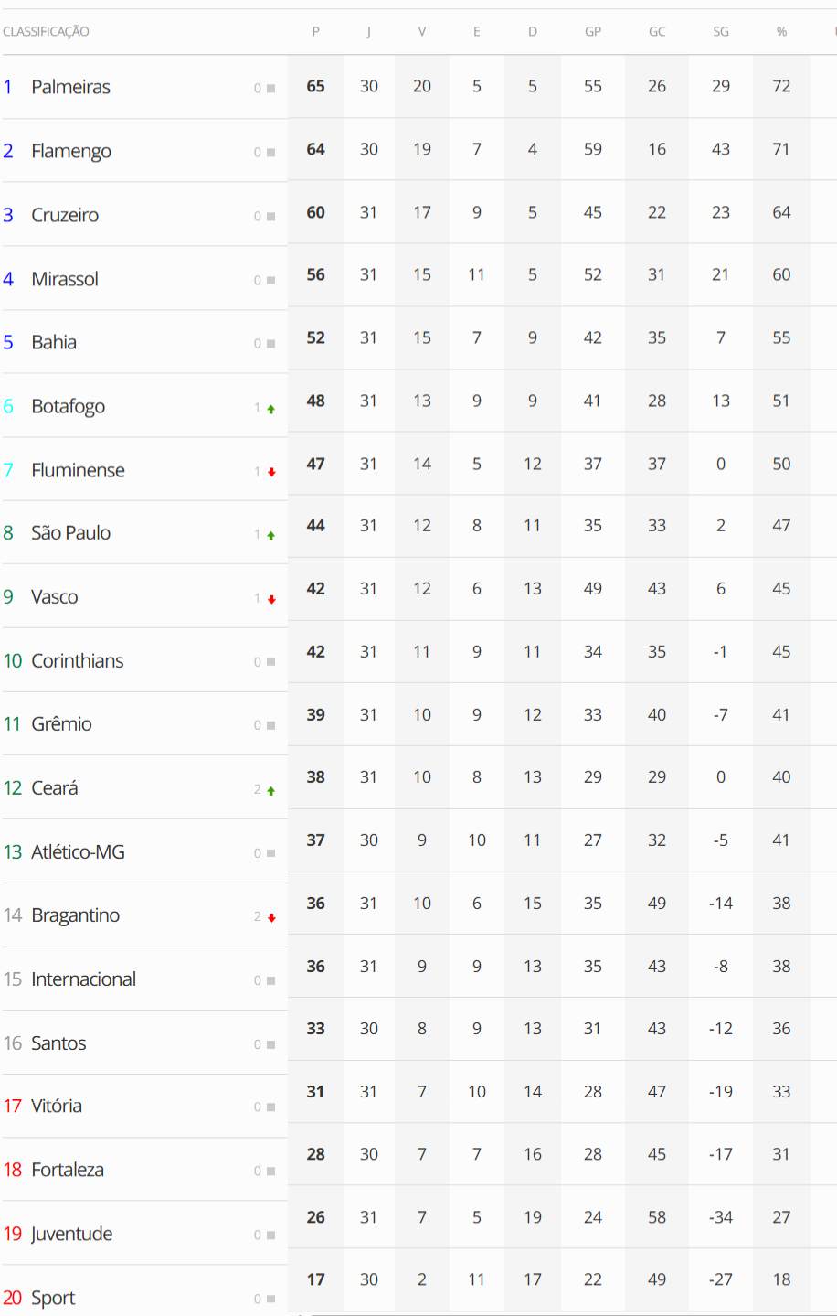 Terminada a 31ª rodada do Campeonato Brasileiro, o Vasco, após a derrota para o São Paulo por 2 a 0, caiu da 8ª para a 9ª posição na tabela.