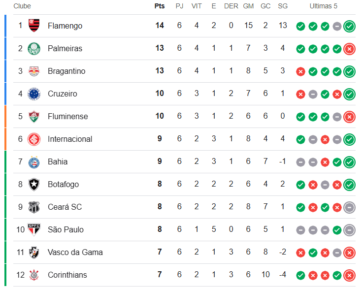 Vasco finaliza a 6ª rodada do Brasileiro na 11ª posição.