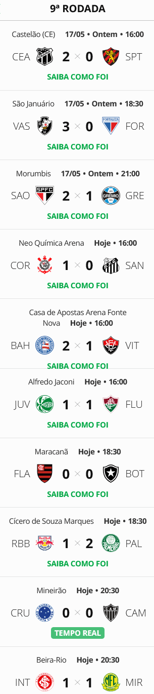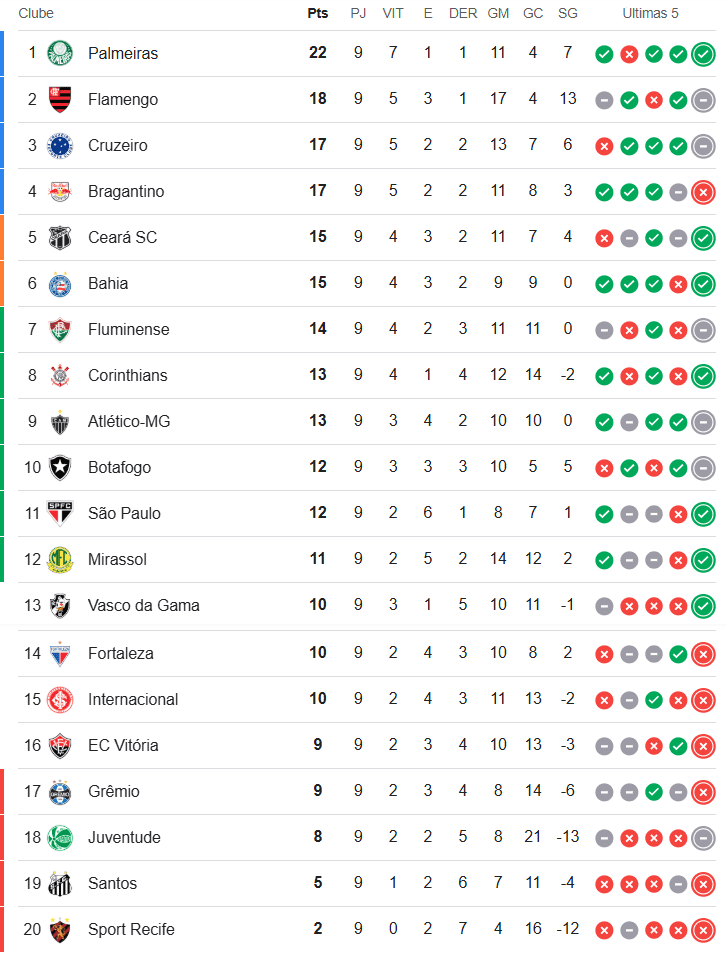 Após a 9ª rodada do Campeonato Brasileiro, o Vasco venceu o Fortaleza por 3 a 0 e avançou da 17ª para a 13ª posição, saindo da zona de rebaixamento.