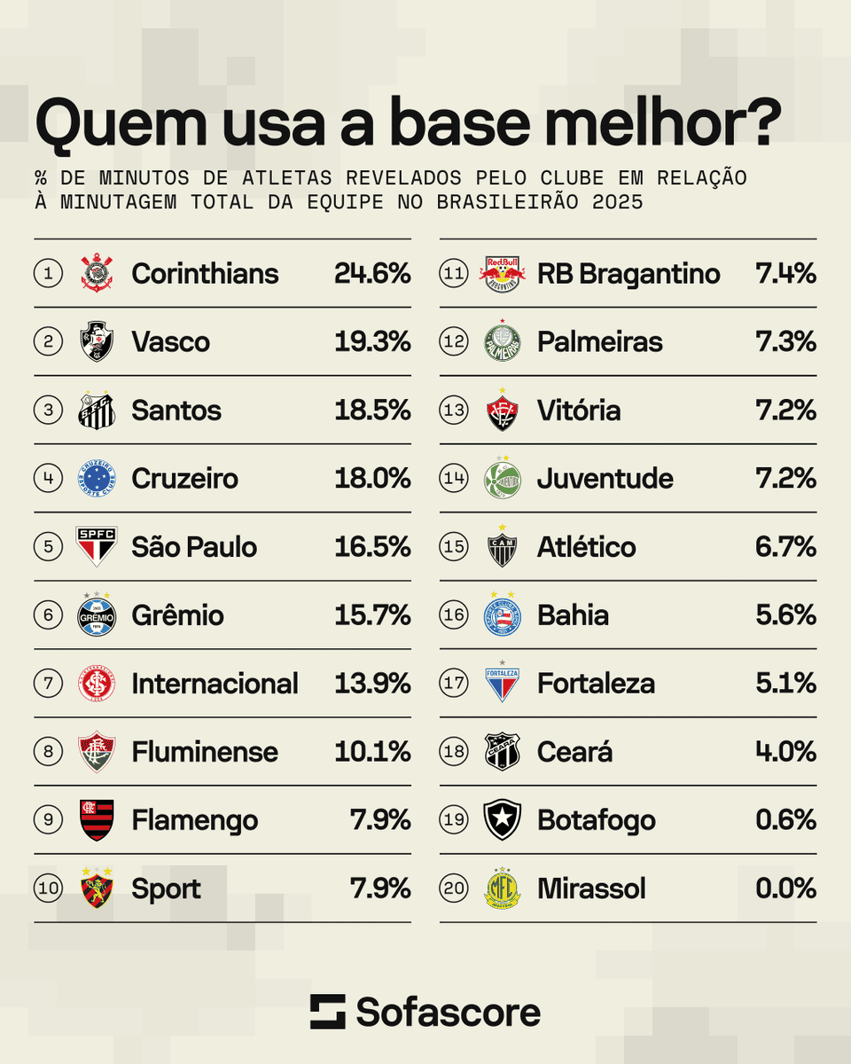 Os clubes que mais promoveram jogadores formados em suas categorias de base no @Brasileirao 2025! 💎💎