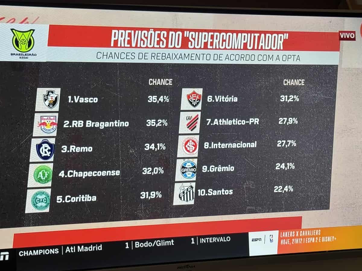 Análise recente do “Supercomputador” da ESPN indica que o Vasco da Gama possui uma maior probabilidade de ser rebaixado no Campeonato Brasileiro. Por outro lado, o Flamengo é apontado como favorito ao título.