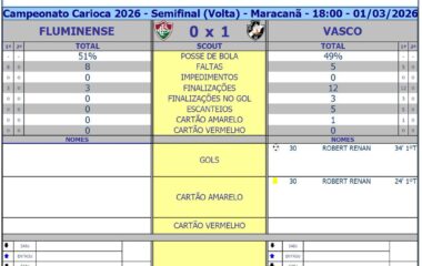 - ⚽ Gustavo Guimarães, aos 11′ do 1ºT (Vasco)