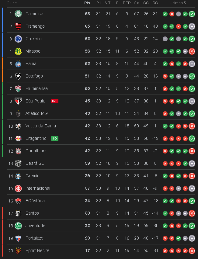 Quatro partidas deram início à 33ª rodada do Campeonato Brasileiro neste sábado. O Vasco, que foi derrotado pelo Juventude em São Januário, ocupa atualmente a 10ª posição na tabela.