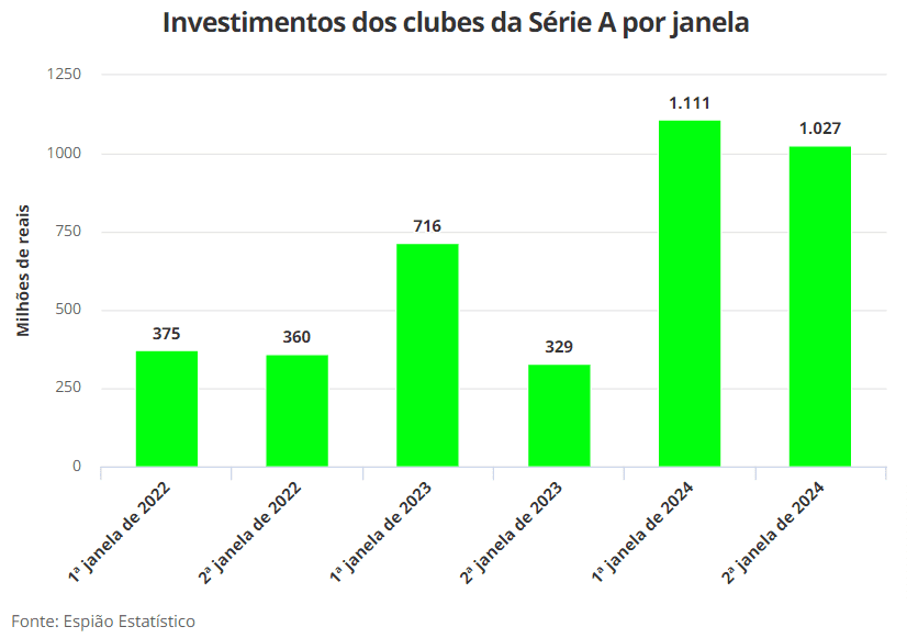 No entanto, o valor é um pouco menor do que o gasto no início do ano, quando os times da elite somaram R$ 1,111 bilhões em 218 reforços. No total deste ano, as cifras ultrapassam os R$ 2 bilhões. Confira os números desde a implementação das janelas em 2022: