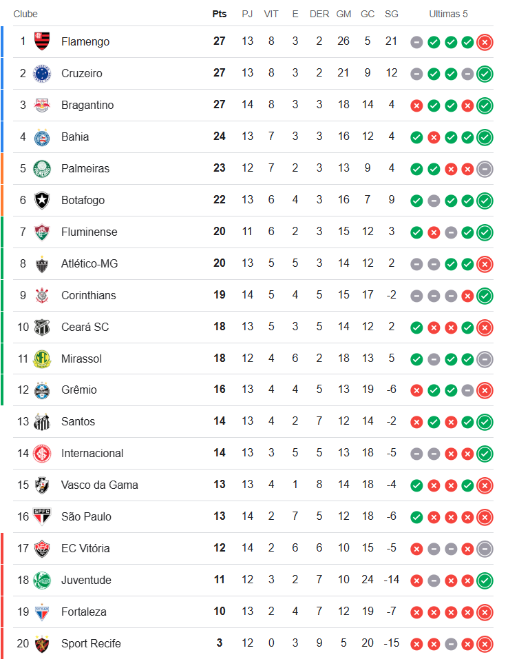 Vasco ocupa a 15ª posição no Campeonato Brasileiro após os jogos da 14ª rodada ocorridos na quarta-feira.
