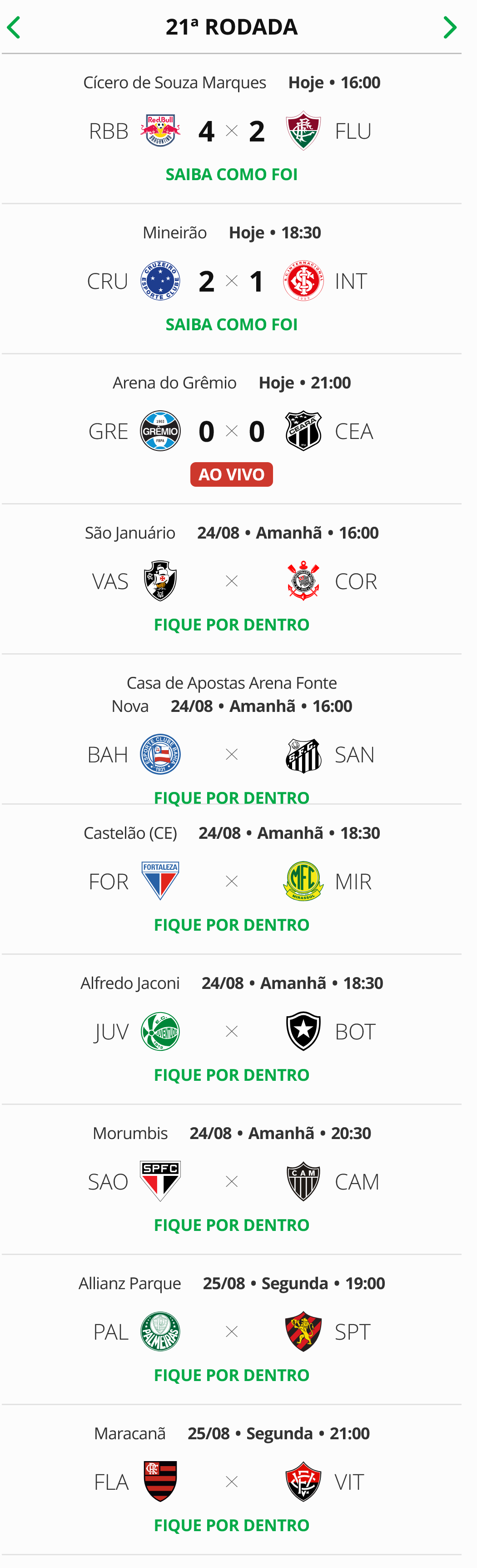 Três partidas deram início à 21ª rodada do Campeonato Brasileiro neste sábado, enquanto o duelo entre Vasco e Corinthians está programado para este domingo.