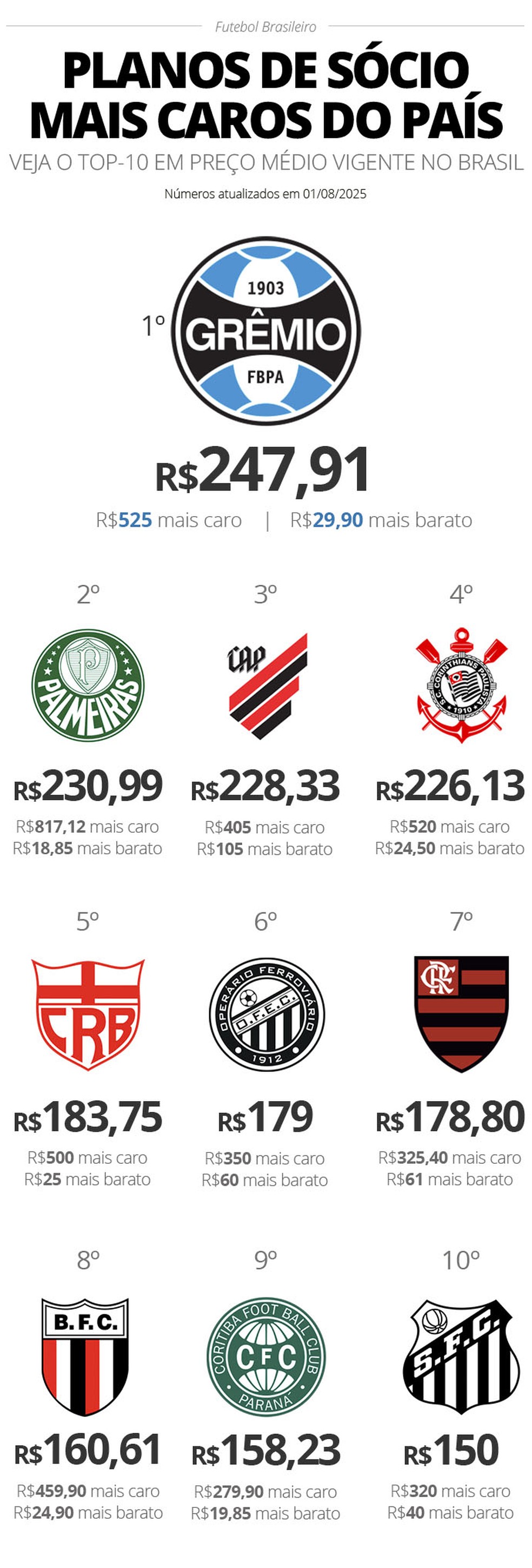 No que diz respeito ao preço médio — que será detalhado a seguir —, Grêmio, Palmeiras e Athletico-PR se destacam, cobrando, em média, mais dos seus associados. Confira abaixo o infográfico com o top 10: