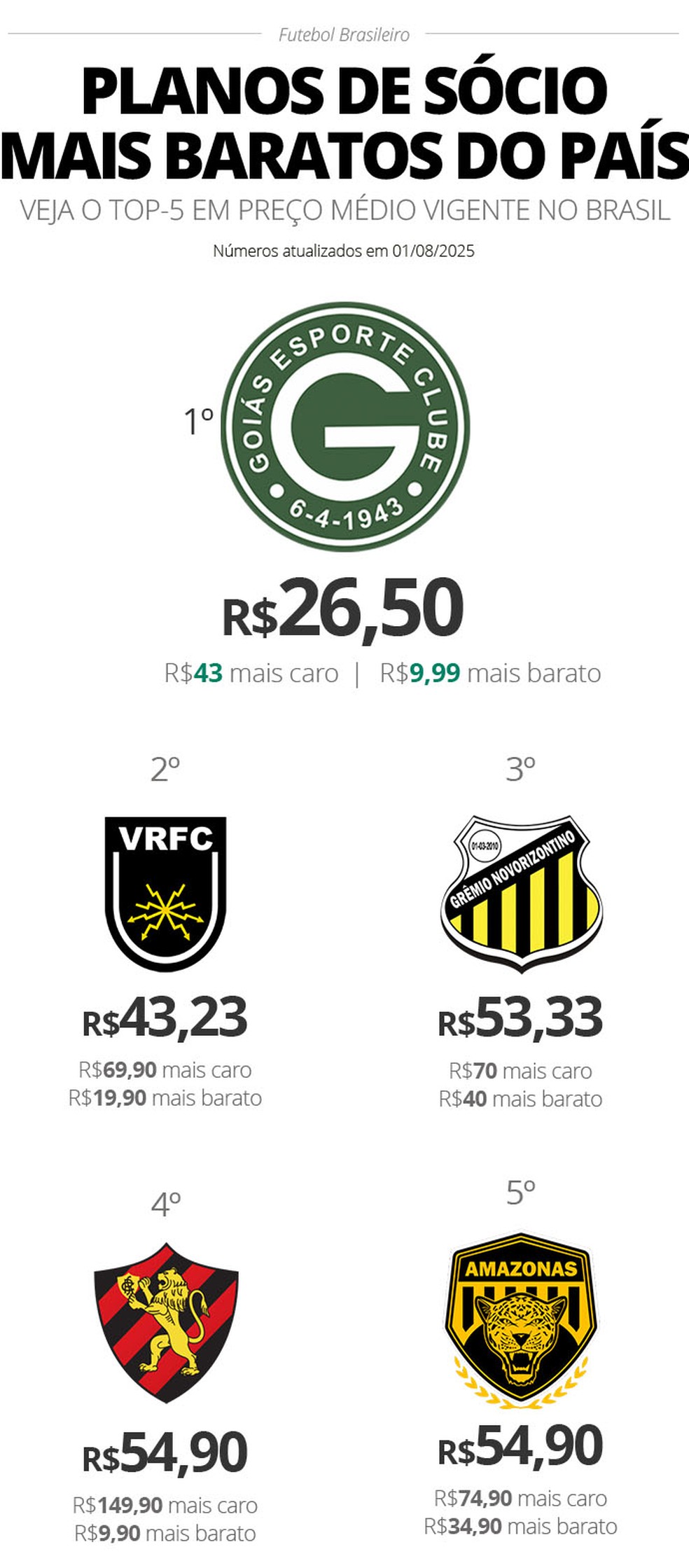 Na sequência, Goiás e Vasco também apresentam opções de planos baratos: o Goiás oferece um plano a R$ 9,99 mensais e o Vasco, com o Camisas Negras, possui mensalidade de R$ 12,98 com prioridade na compra de ingressos.