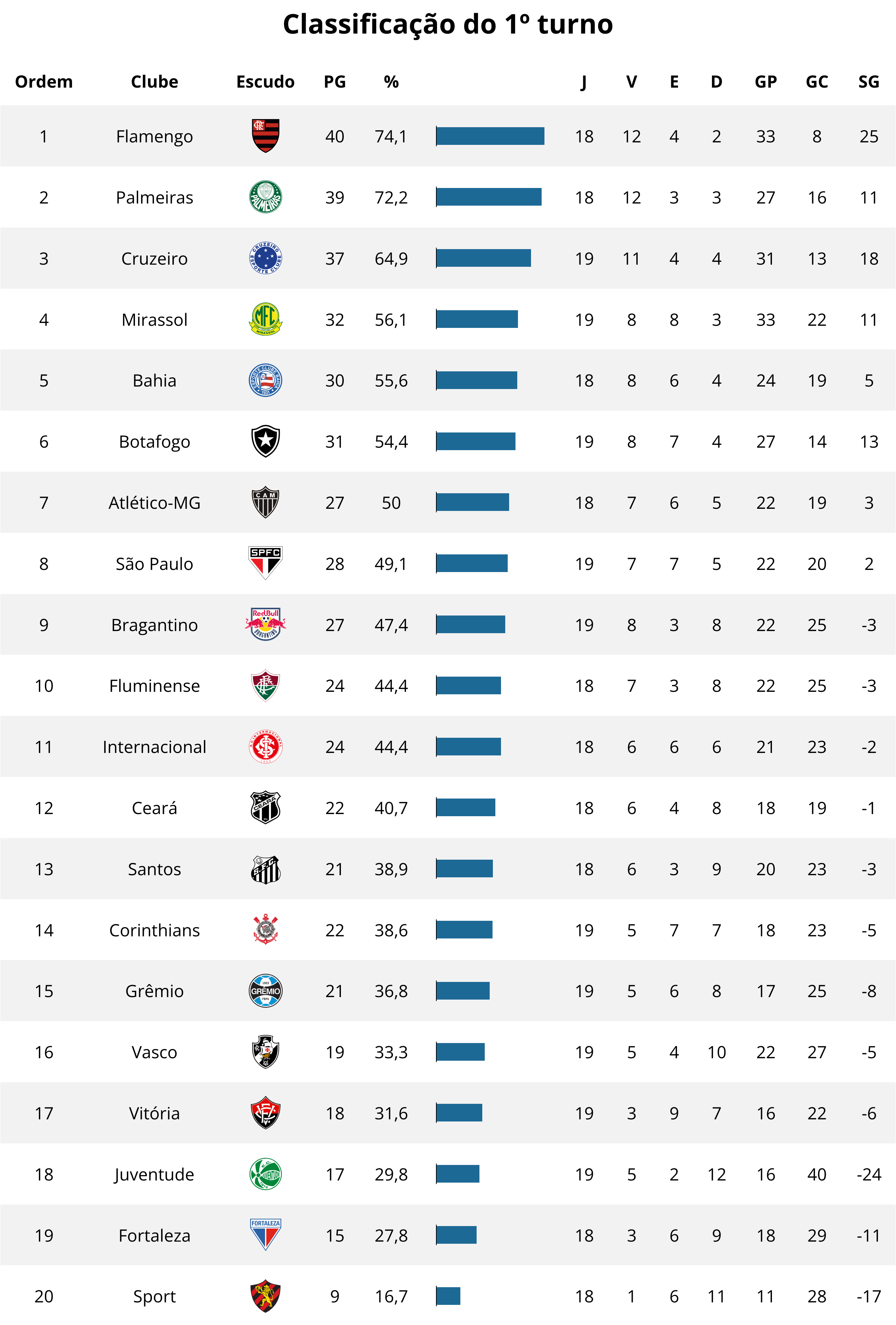 Revise abaixo a classificação do primeiro turno do campeonato. Com 10 equipes ainda precisando realizar um jogo, a classificação está organizada de acordo com o aproveitamento de pontos, cuja ordem dos líderes no primeiro turno foi invertida. O Flamengo possui a melhor campanha, com um ponto a mais que o Palmeiras.