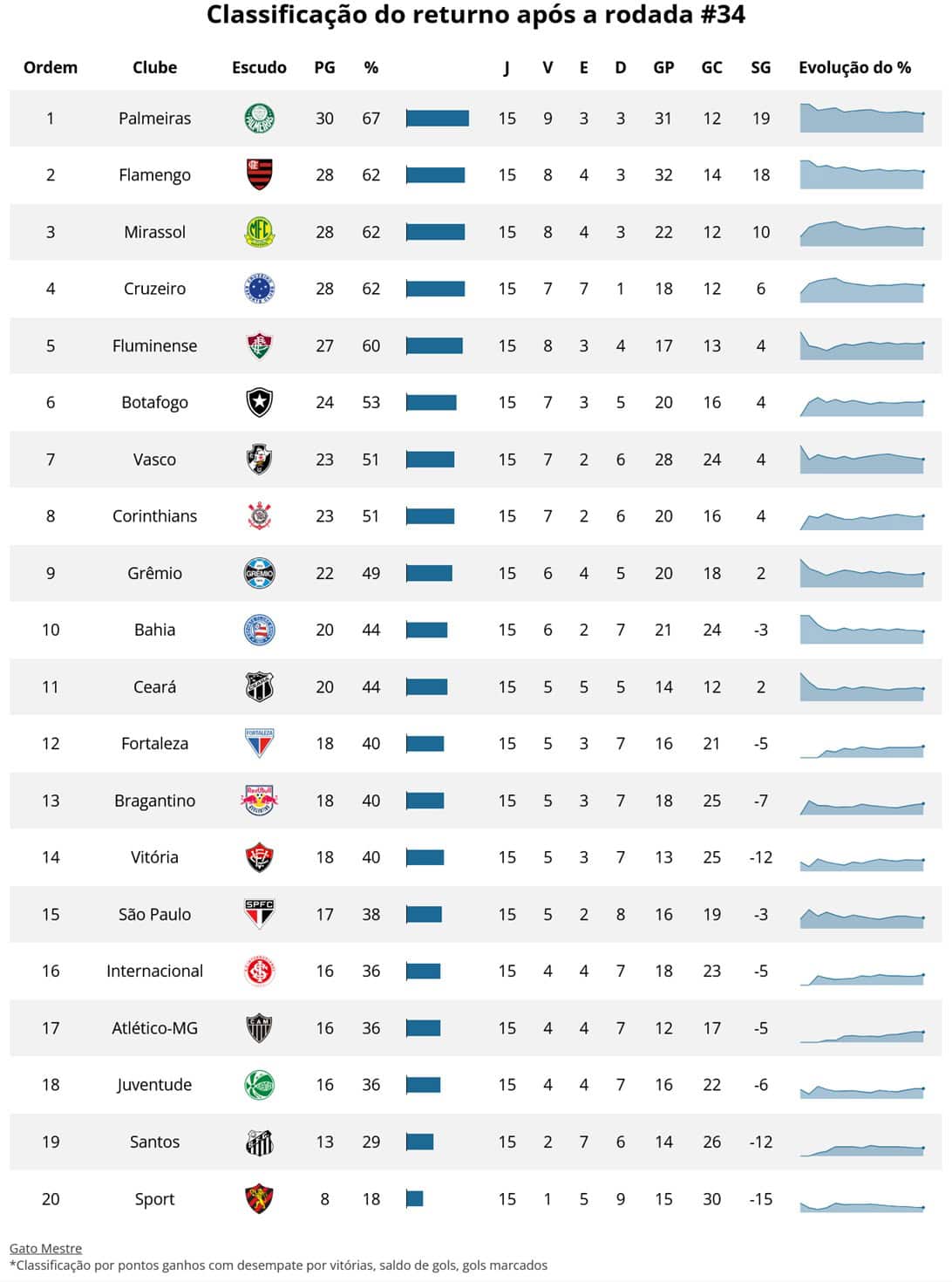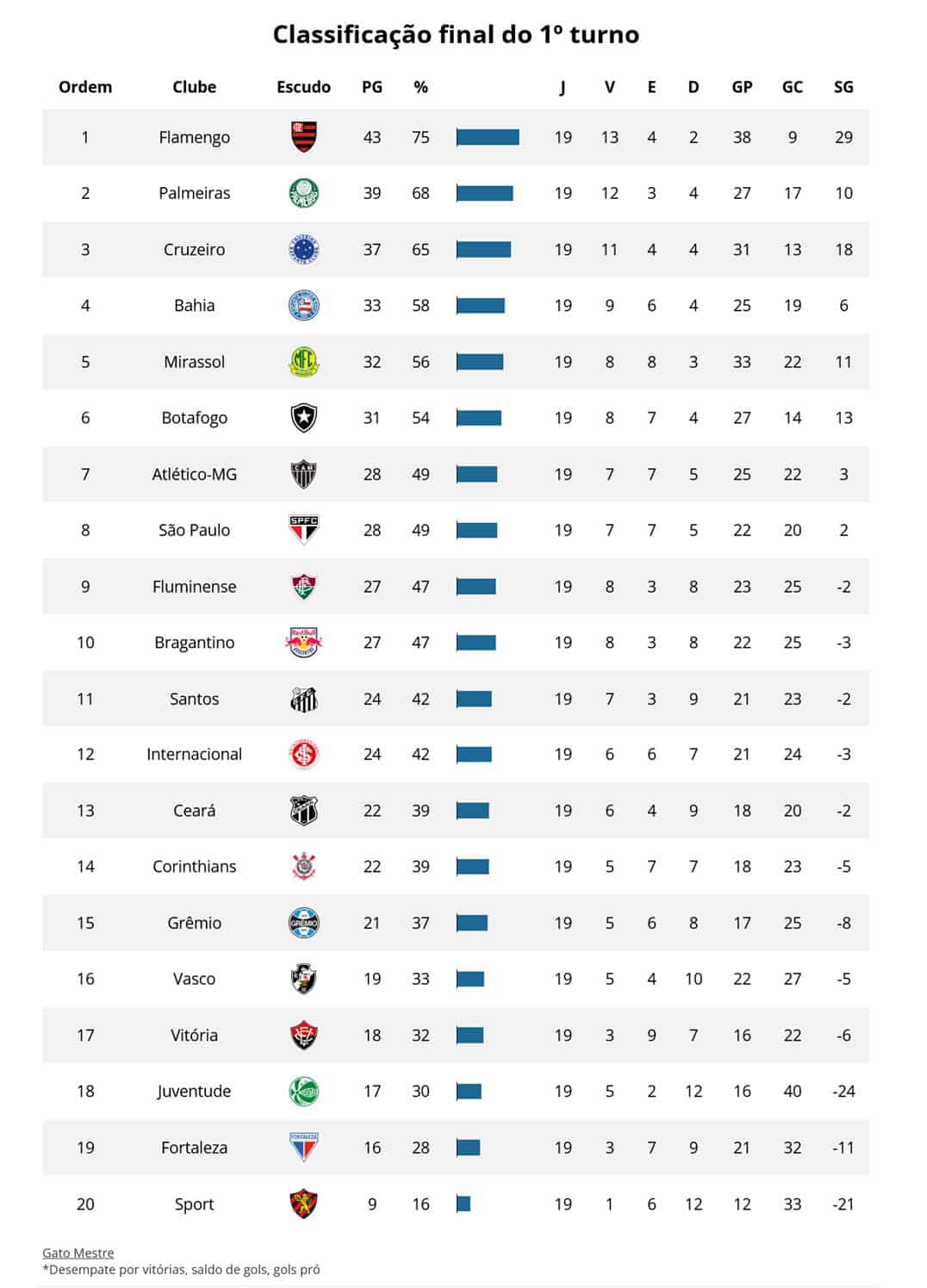 Confira abaixo a classificação do primeiro turno do campeonato e analise a performance das equipes em ambas as metades da competição.