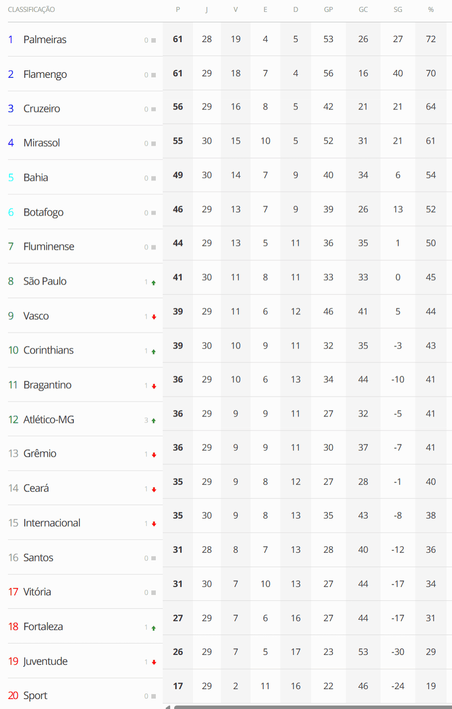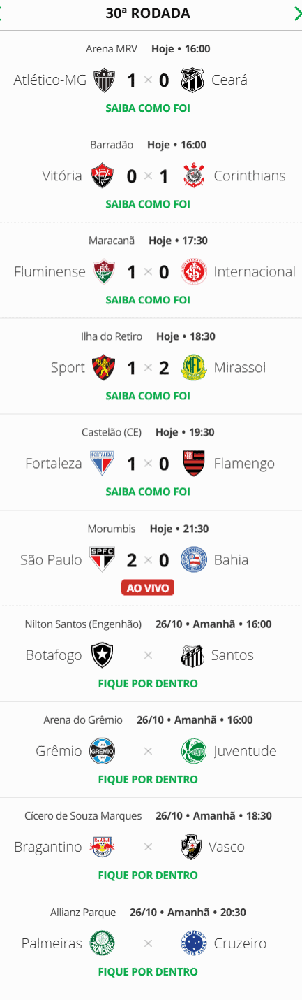 Seis partidas deram início à 30ª rodada do Campeonato Brasileiro neste sábado. O Vasco, que jogará contra o Red Bull Bragantino neste domingo em São Paulo, ocupa atualmente a 9ª posição na tabela.