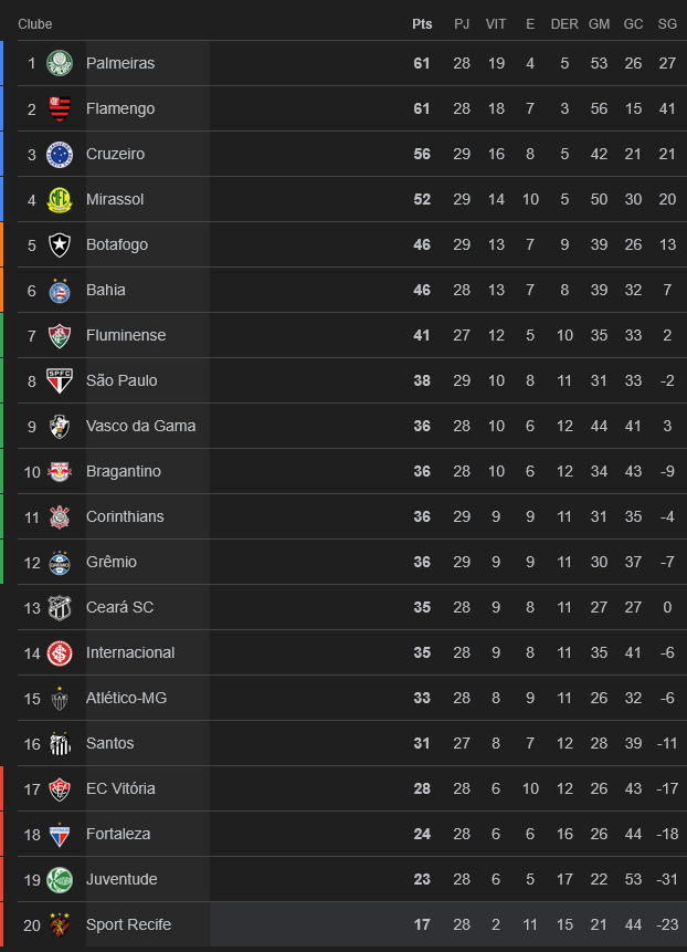 Terminados os jogos deste domingo da 29ª rodada do Campeonato Brasileiro, o Vasco, que enfrenta o Fluminense nesta segunda-feira no Maracanã, ocupa a 9ª colocação.