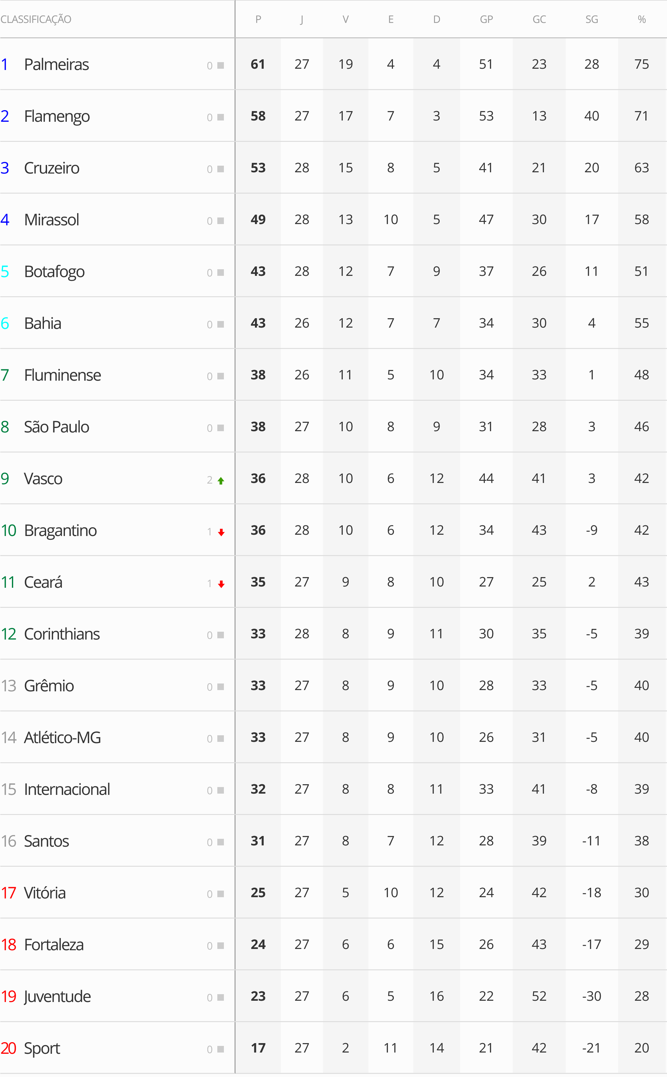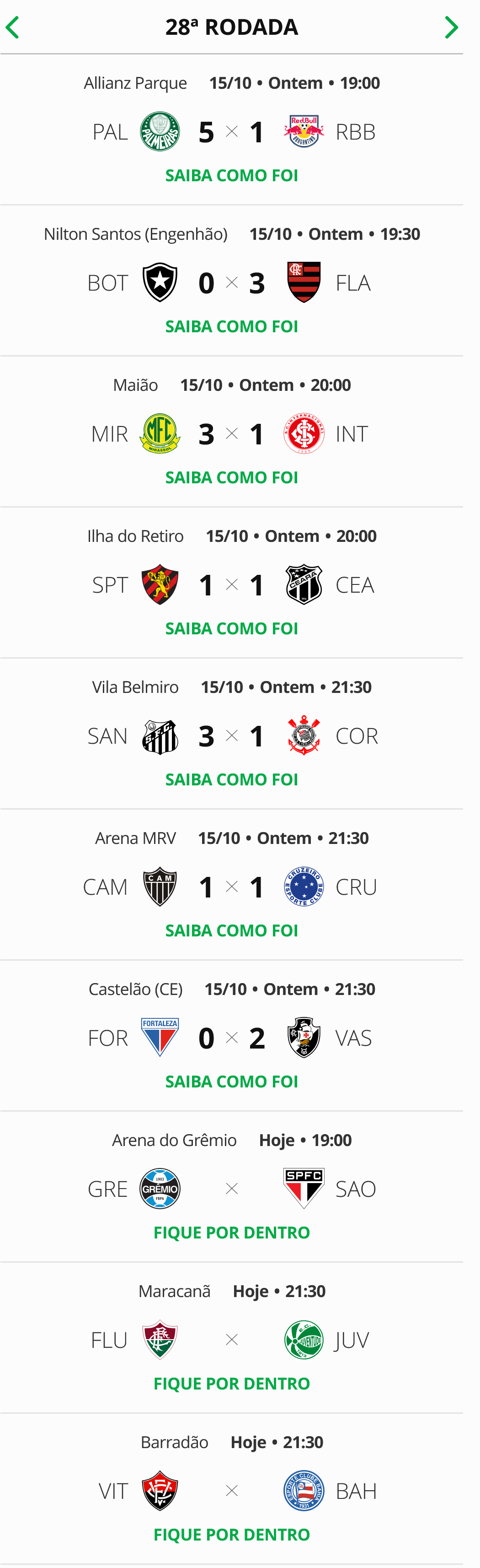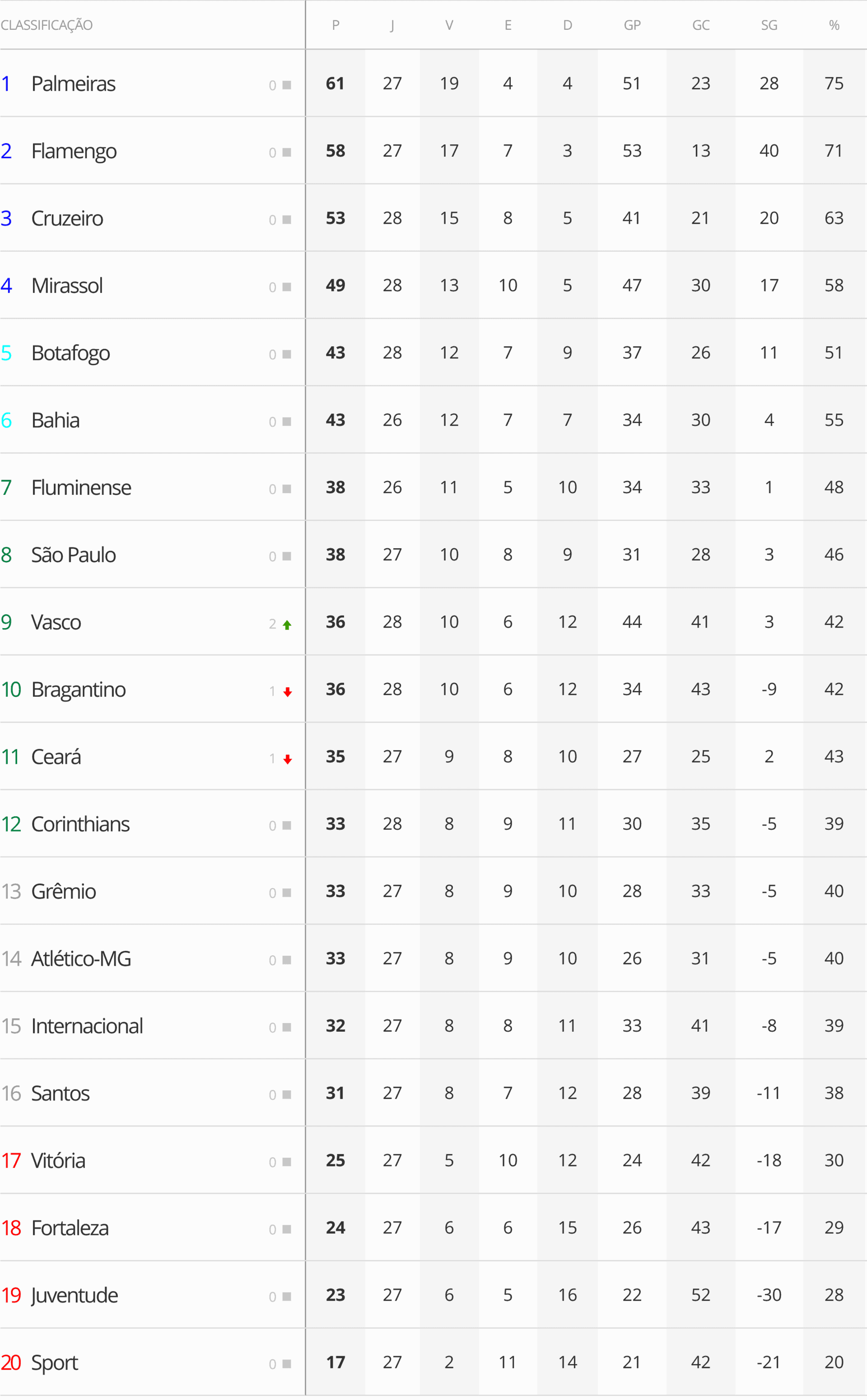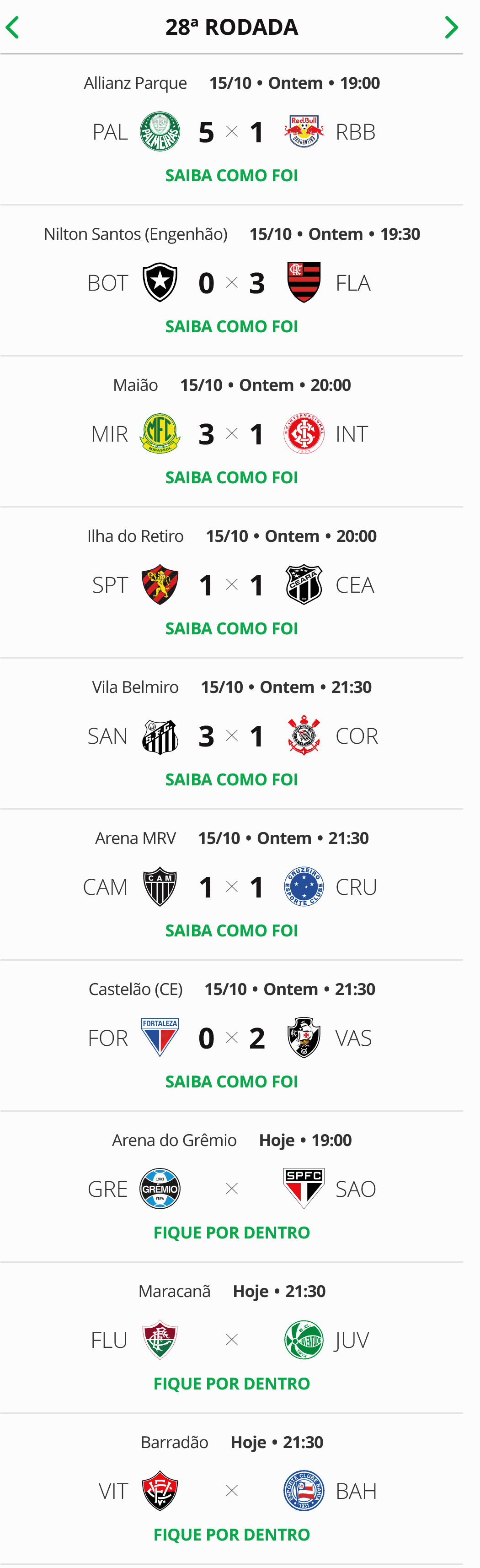 Sete partidas marcaram a 28ª rodada do Campeonato Brasileiro. O Vasco, após conquistar uma vitória fora de casa sobre o Fortaleza, com um placar de 2 a 0, ascendeu para a 9ª posição na tabela.
