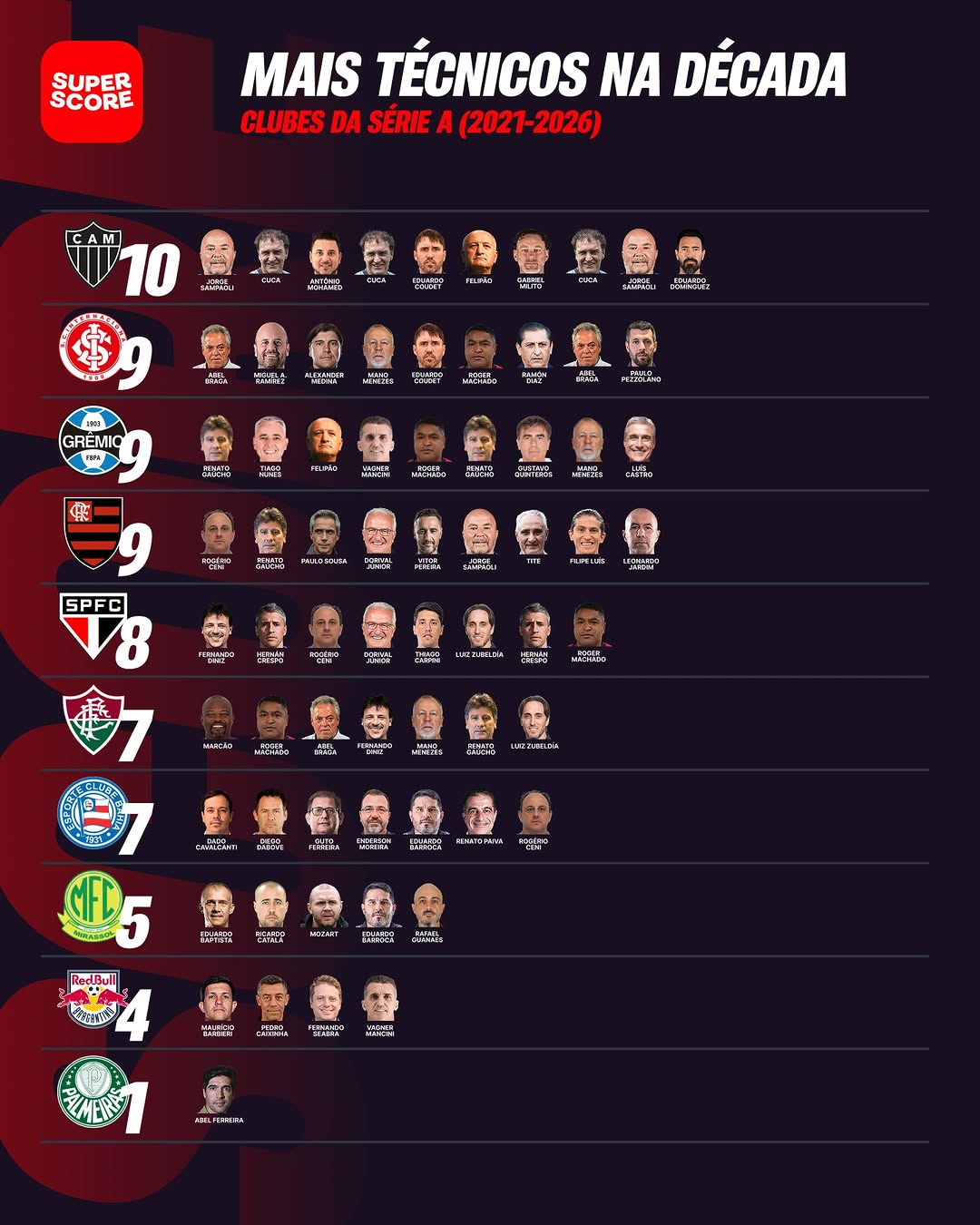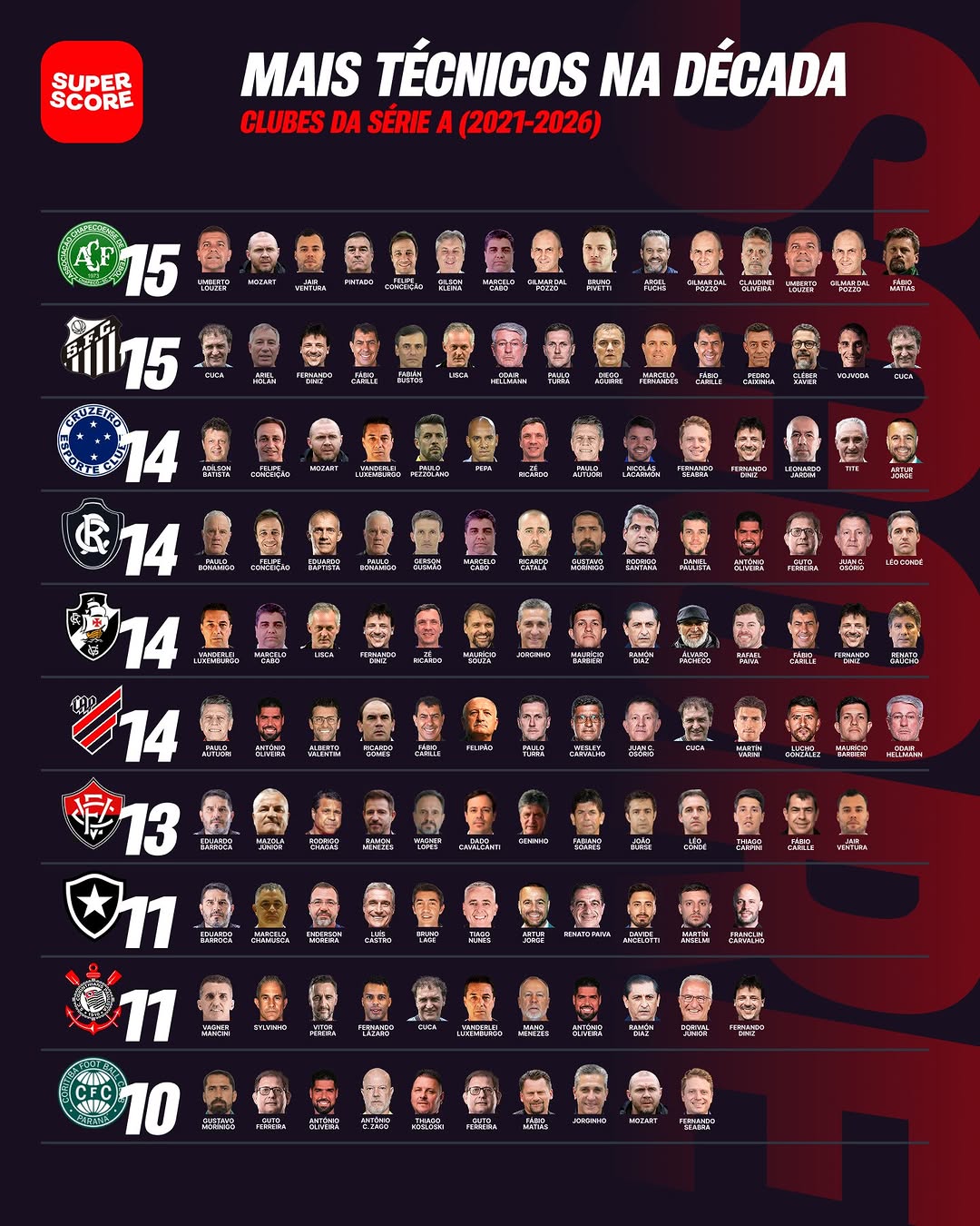 Vasco ocupa a terceira posição em trocas de treinadores na Série A na última década; confira ranking
