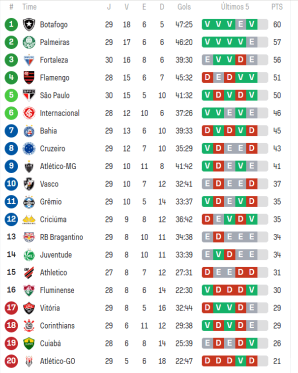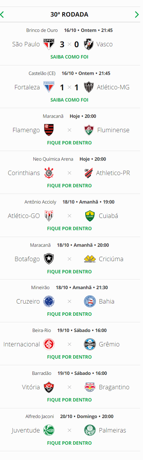 Após o apito final dos confrontos de quarta-feira pela 30ª rodada do Campeonato Brasileiro, o Vasco, que sofreu uma derrota de 3 a 0 diante do São Paulo em Campinas, permanece na 10ª posição.