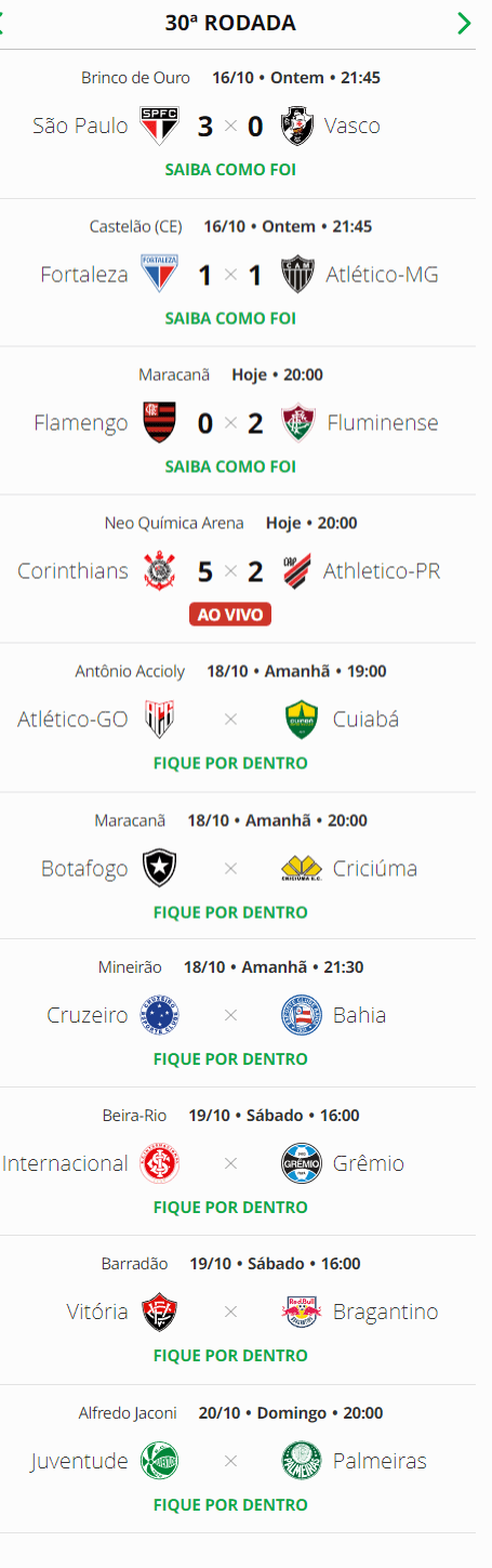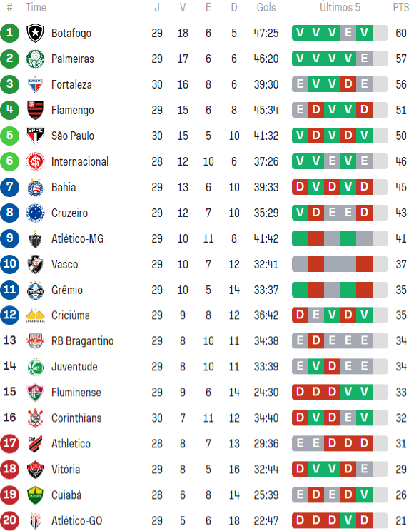 Após o apito final dos duelos de quinta-feira na 30ª rodada do Campeonato Brasileiro, o Vasco, que foi derrotado pelo São Paulo por 3 a 0 em Campinas, permanece na 10ª posição da tabela.