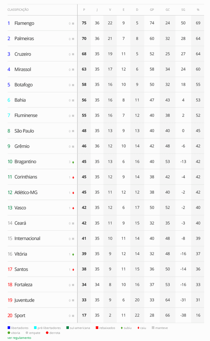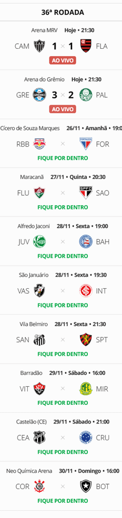 Dois jogos deram início, nesta terça-feira, à 36ª e penúltima rodada do Campeonato Brasileiro. O Vasco permanece na 13ª colocação, apenas 4 pontos acima da zona de rebaixamento. O Gigante da Colina enfrentará o Internacional nesta sexta-feira, às 19h30, em São Januário.