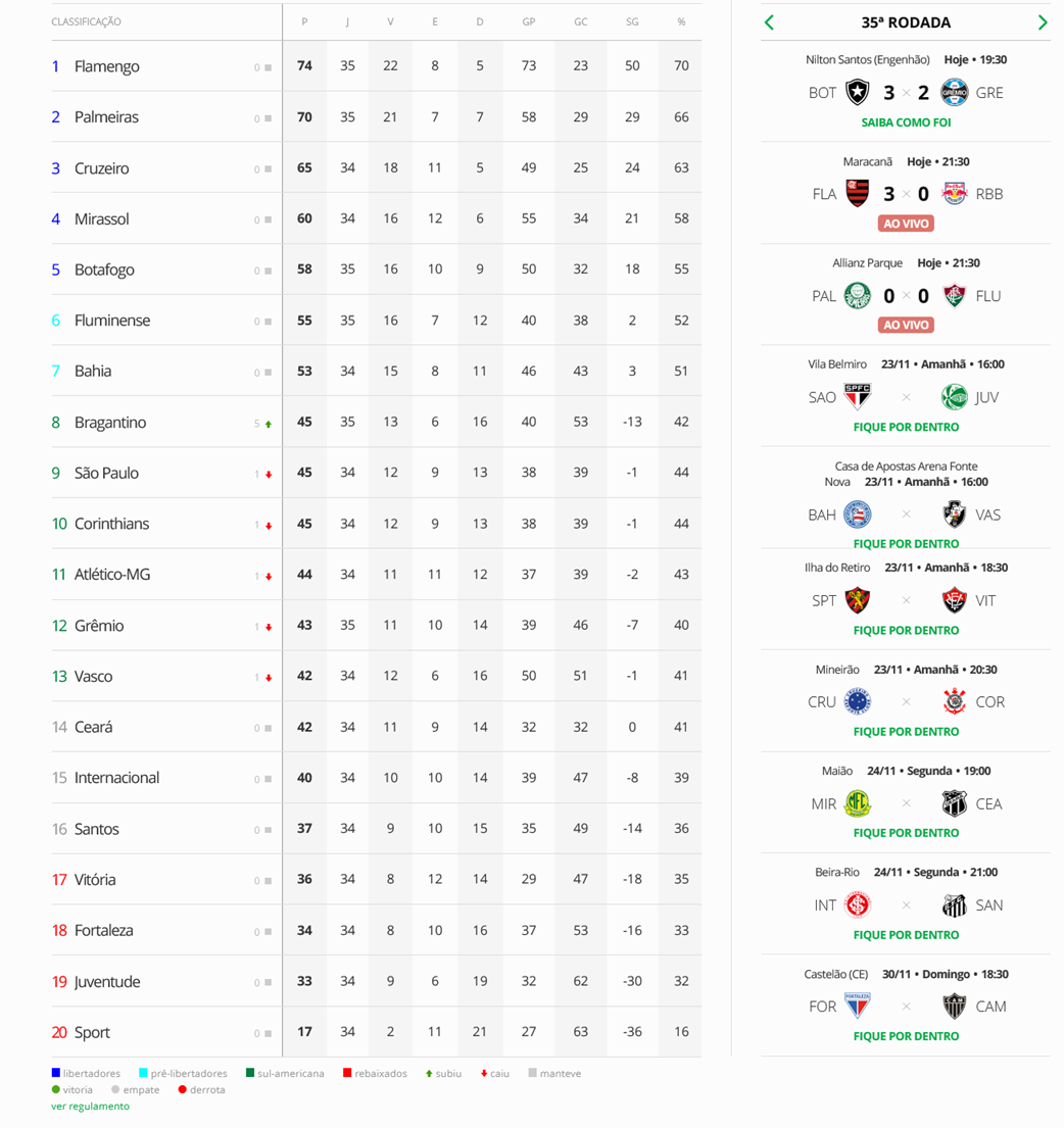 Três partidas marcaram o início da 35ª rodada do Campeonato Brasileiro, realizada neste sábado. O Vasco se mantém na 13ª posição e está prestes a enfrentar o Bahia neste domingo, às 16h, na Fonte Nova. Uma vitória pode alavancar o time para pelo menos duas posições, permitindo que ultrapasse Grêmio e Red Bull Bragantino.