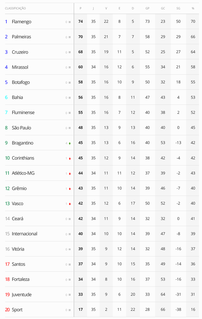 Terminados os jogos de domingo da 35ª rodada do Campeonato Brasileiro, o Vasco, que sofreu uma derrota para o Bahia por 1 a 0, permanece na 13ª posição. Entretanto, o Gigante da Colina ainda corre o risco de cair mais duas colocações nesta segunda-feira.