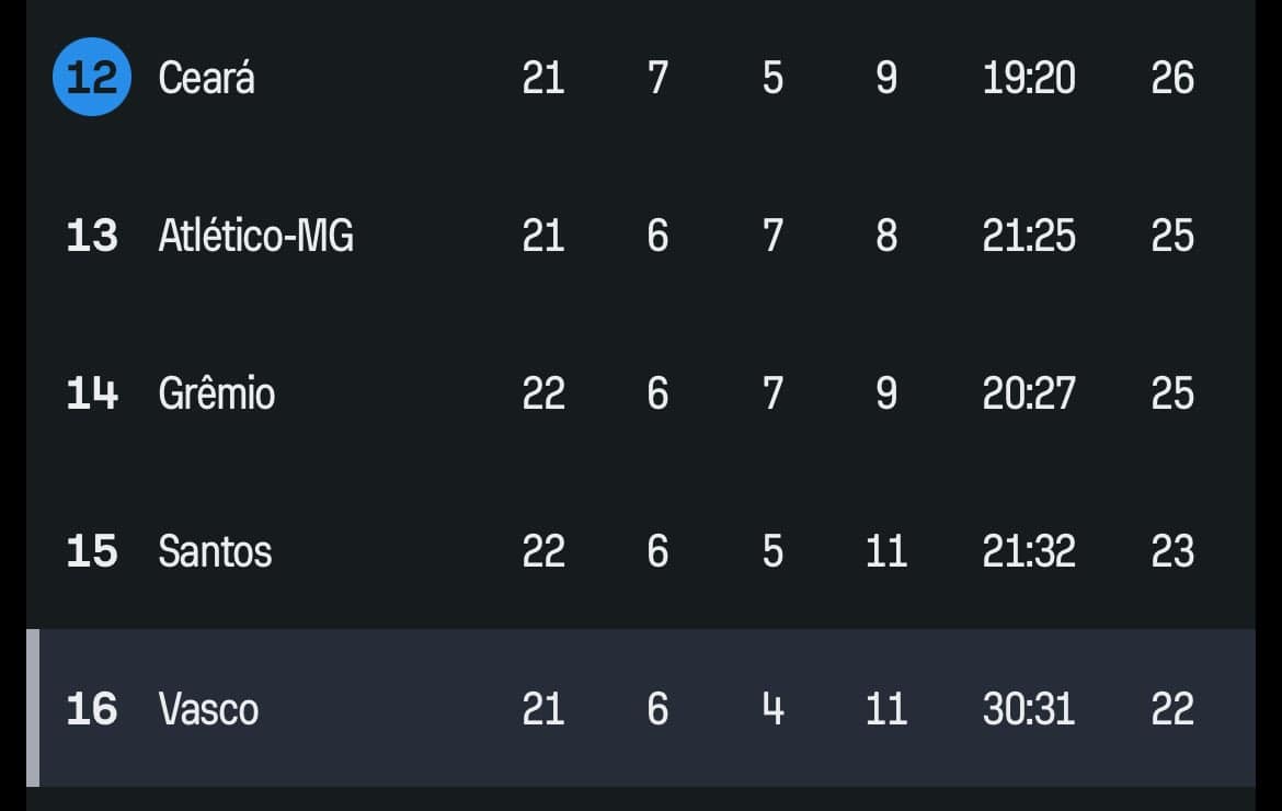 Caso o Vasco consiga uma vitória hoje, o time avançará três posições na tabela do Campeonato Brasileiro.