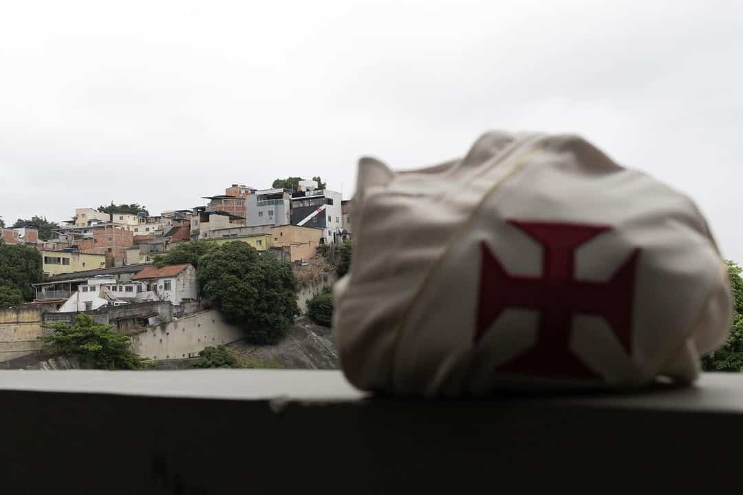 Vasca com escudo do clube estampado em uniforme branco. Alvo: mochila com escudo do Vasco, na arquibancada. Saco de roupa com Cruz de Malta do Vasco da Gama. Bola de futebol com brasão do Vasco da Gama.