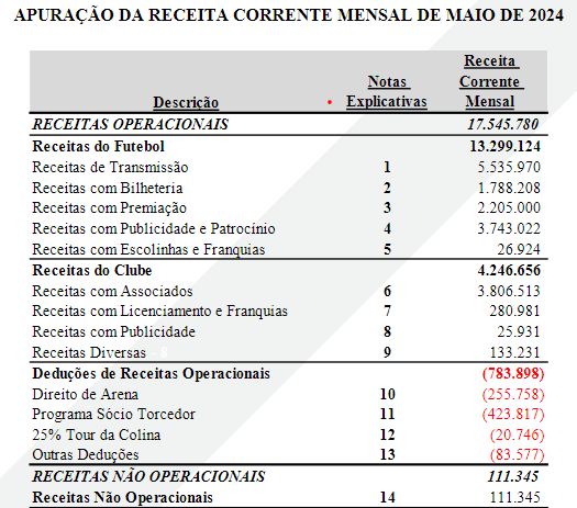A receita operacional da Sociedade Anônima de Futebol no período atingiu R$ 17.657.126,00.