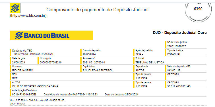 O clube carioca também quitou a parcela do RCE Cível, no montante de R$ 843.661,38.