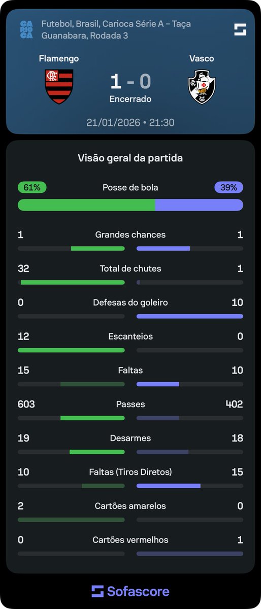 Vasco registrou apenas 1 chute, enquanto o Flamengo finalizou 32 vezes.