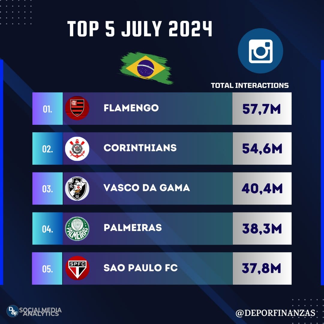 🇧🇷 As 5 equipes brasileiras com mais interatividade no durante julho de 2024! Total engajamentos 1. 57,7M 2. 54,6M 3. 40,4M 4. 38,3M 5. 37,8M Foto: reprodução/Deportes&Finanzas