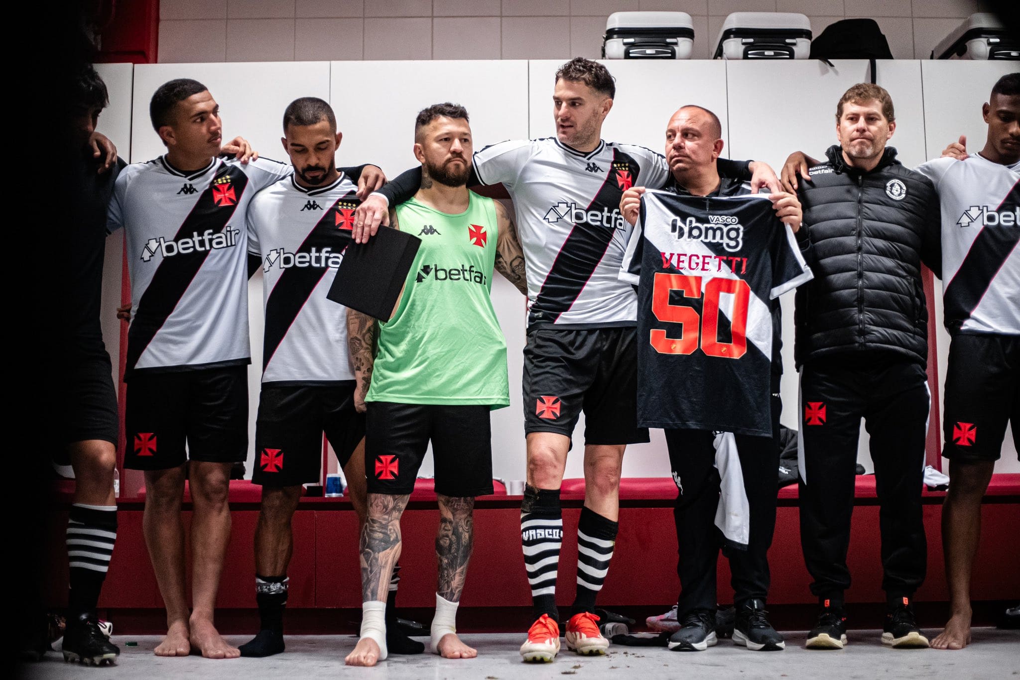 Depois de vencer o Internacional, o avançado Vegetti foi presenteado por Pedrinho, o Presidente, com uma camiseta especial em celebração aos 50 jogos completados pelo Gigante da Colina! 💢