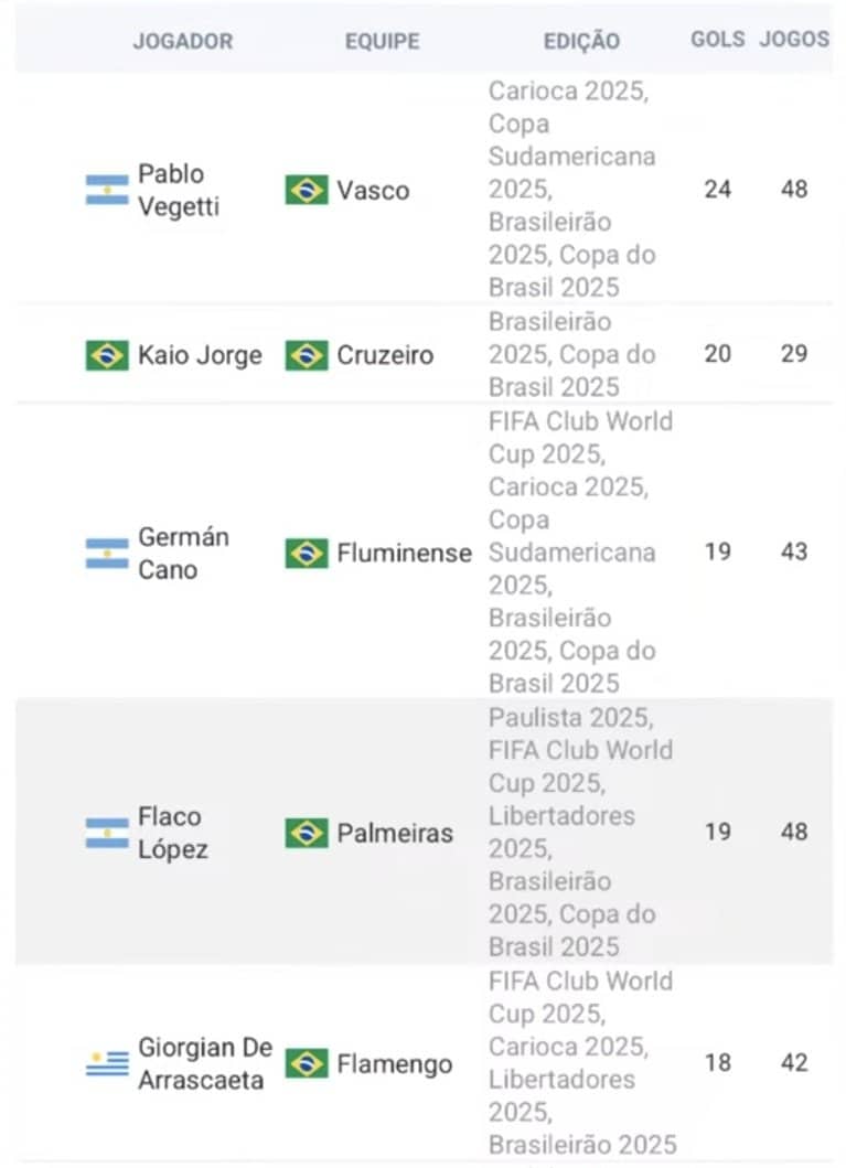 🚨 ARTILHARIA DO FUTEBOL BRASILEIRO NA TEMPORADA 2025: