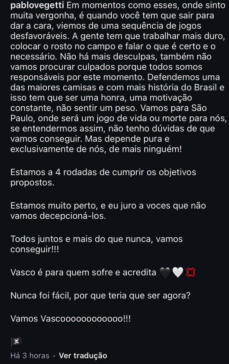— Em tempos como esse, quando a vergonha é grande, é hora de se mostrar. Passamos por uma fase difícil em nossos jogos. Precisamos trabalhar com mais empenho, dar a cara a tapa e agir com honestidade. Chega de desculpas, também não vamos buscar quem culpar, pois todos nós somos responsáveis por este momento. Vestimos uma das maiores camisas do Brasil, cheia de história, e isso deve ser uma honra, uma motivação constante, sem carregar peso nas costas.
