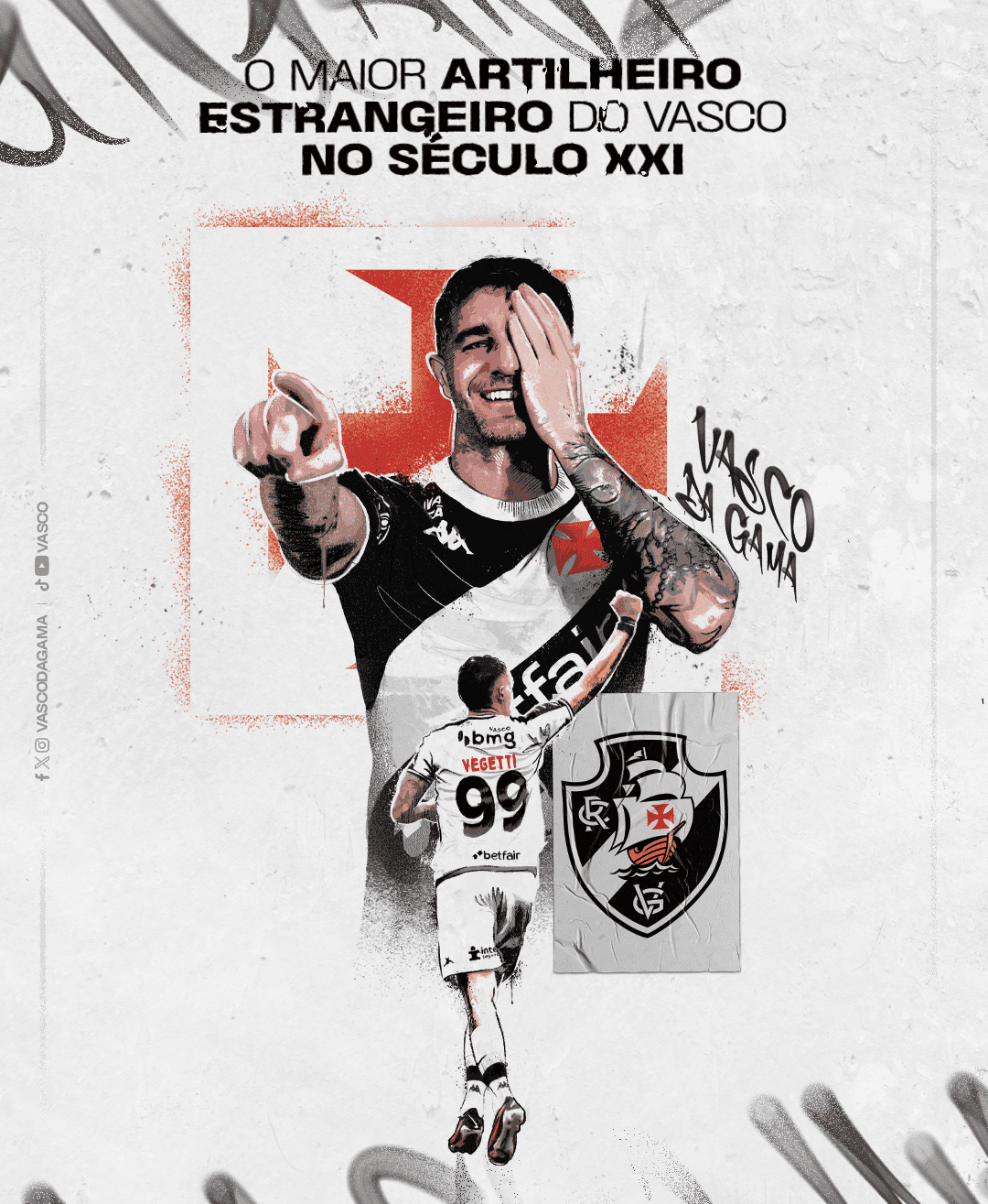 Neste sábado, durante a partida contra o Sport em São Januário, o Vasco da Gama preparou uma homenagem especial para o camisa 99. Ele receberá um quadro com sua arte – divulgada nas redes sociais do clube – além de uma placa comemorativa reconhecendo esse importante feito.