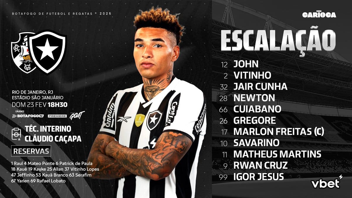 Veja a escalação do Botafogo para o confronto contra o Vasco; o ex-jogador do Vasco, Rwan Cruz, será titular.