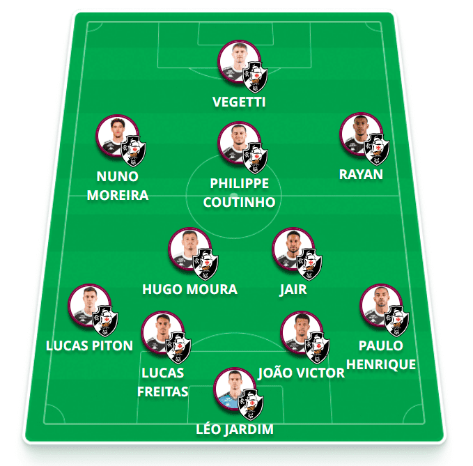 Provável escalação do Vasco: Léo Jardim, Paulo Henrique, João Victor, Lucas Freitas, Lucas Piton, Hugo Moura, Jair (Paulinho), Coutinho, Rayan, Nuno Moreira (Garré) e Vegetti.