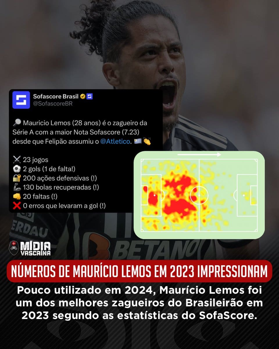 💢⚽️📊 Confira os dados @SofascoreBR do defensor Maurício Lemos, que vem brilhando com a camisa do Galo no Campeonato Brasileiro de 2023.